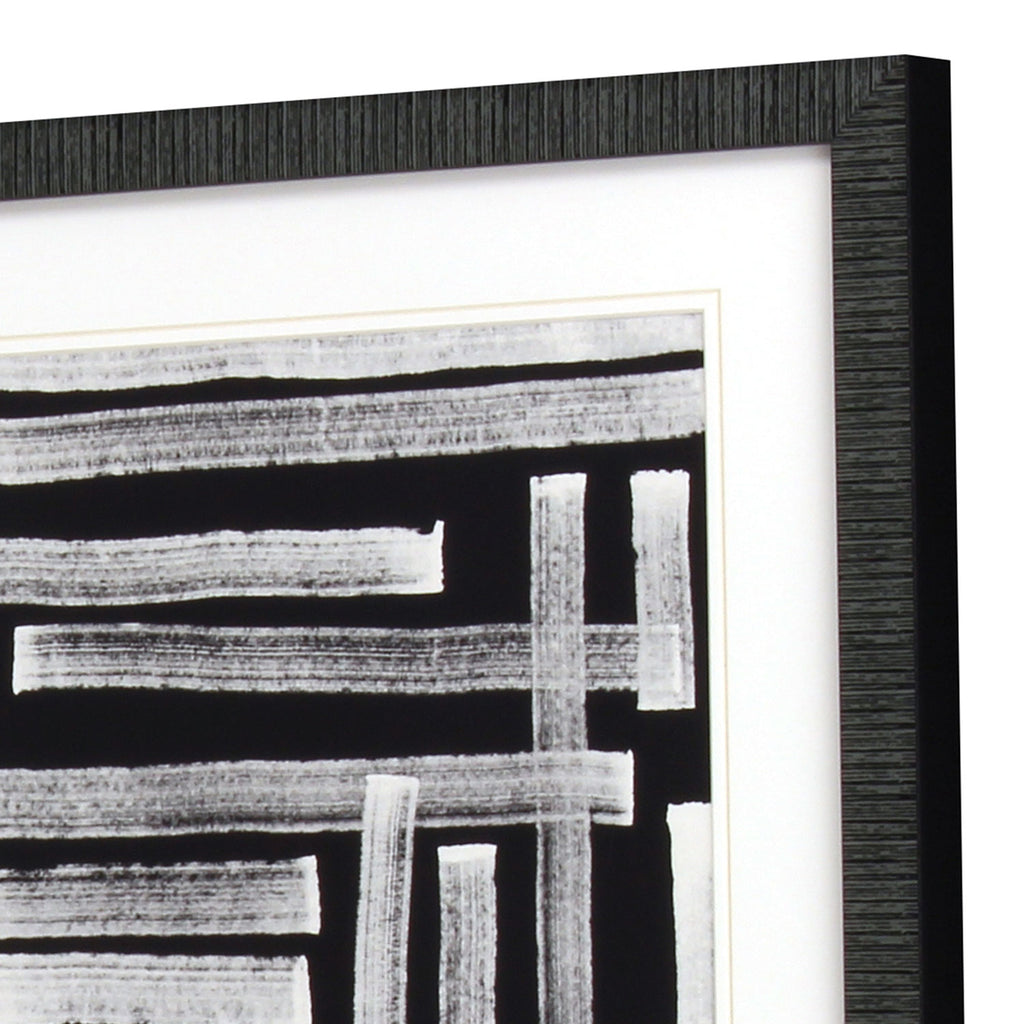 An abstract series features twirling lines in geometric shapes. Matted in white and framed in a distressed black finish moulding with gray wash. Sold as set of three.