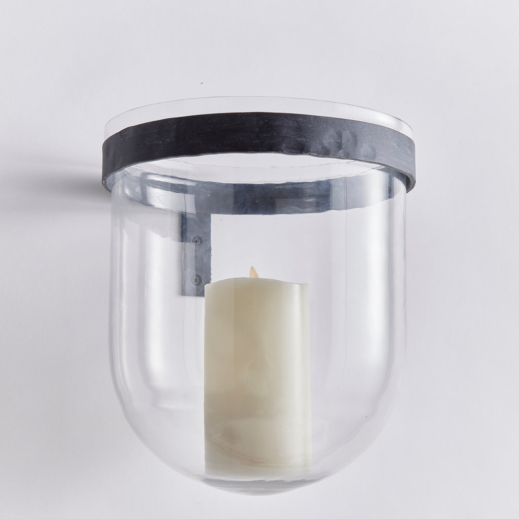 With an aged zinc band and substantial blown glass rounded vase, this wall vessel is a sleek, simple design. A great way to display your favorite plants, flowers or even a candle.