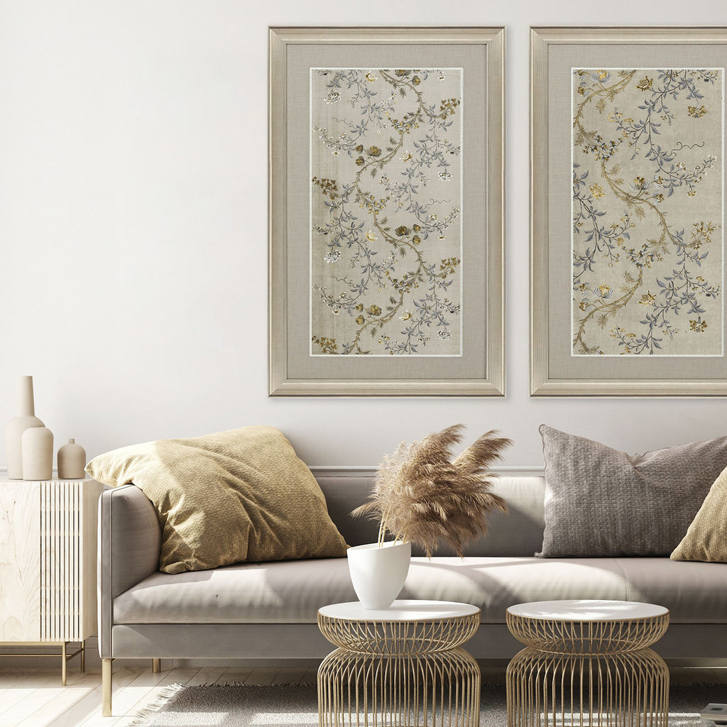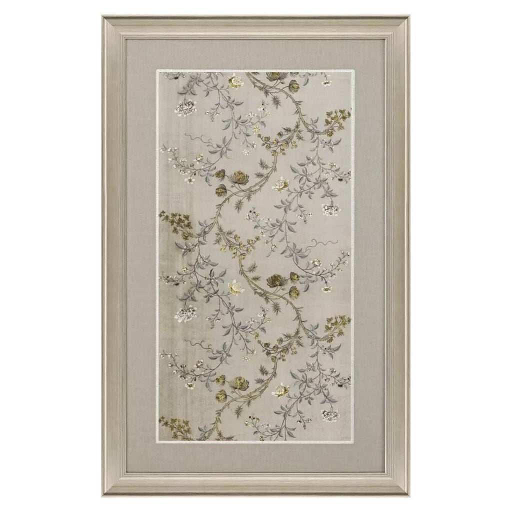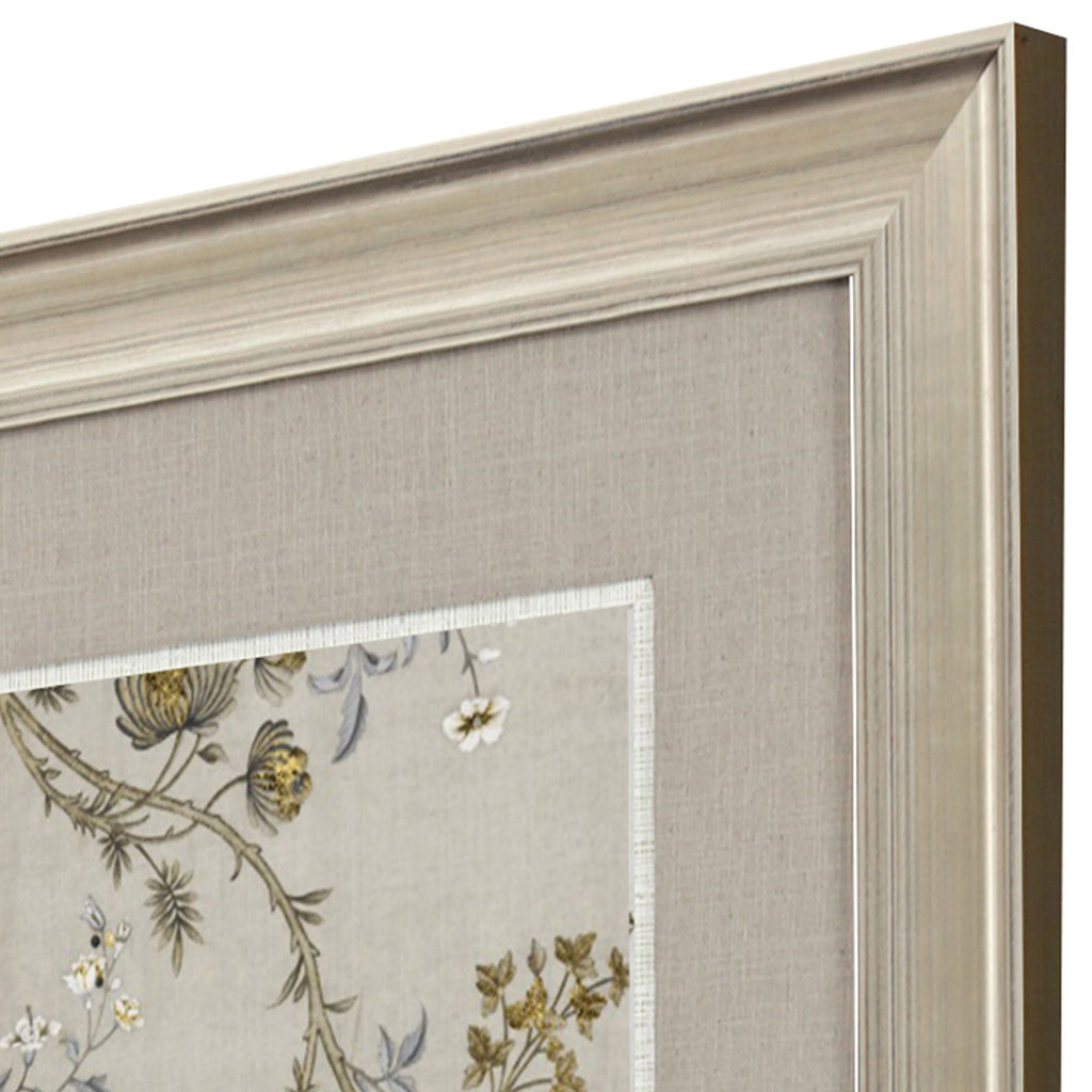 Floral giclee features hand wrapped fabric matting with hand applied decorative papers. Framed in an aged silver modern wood.