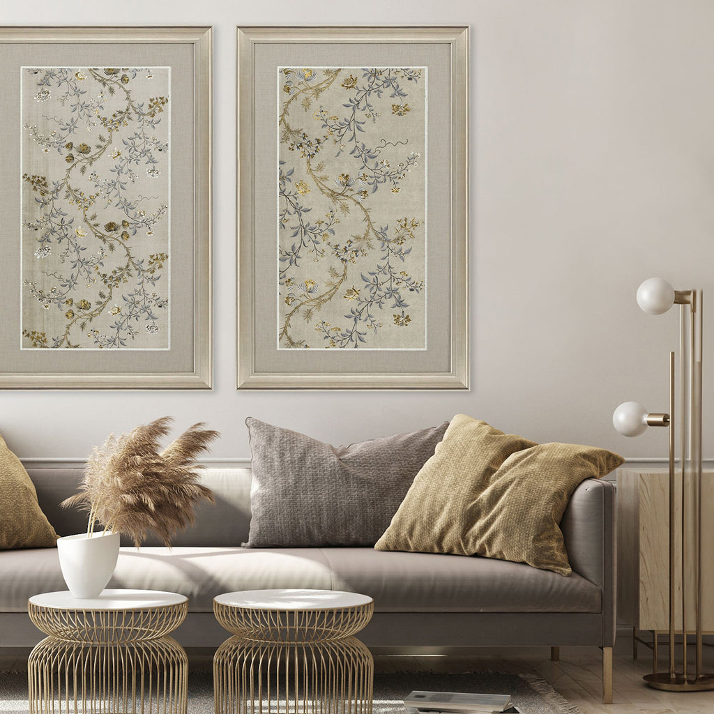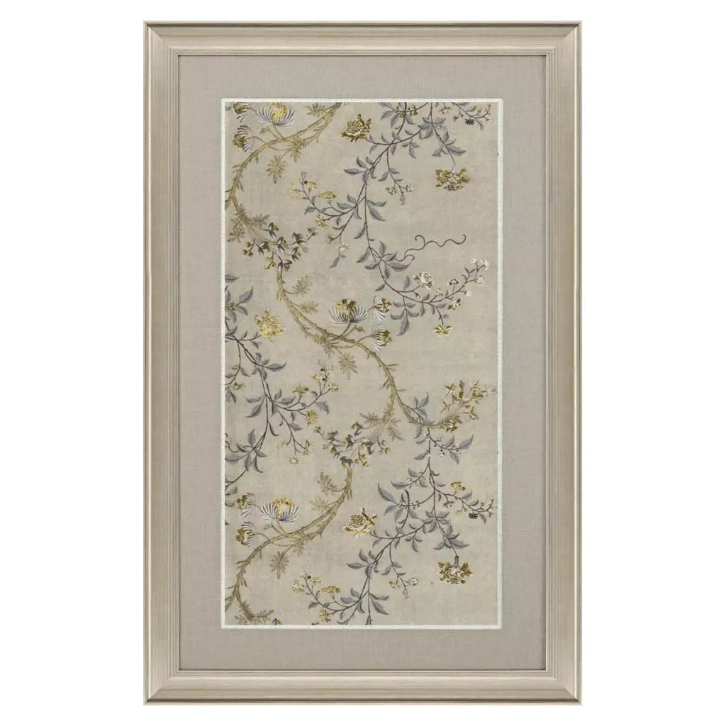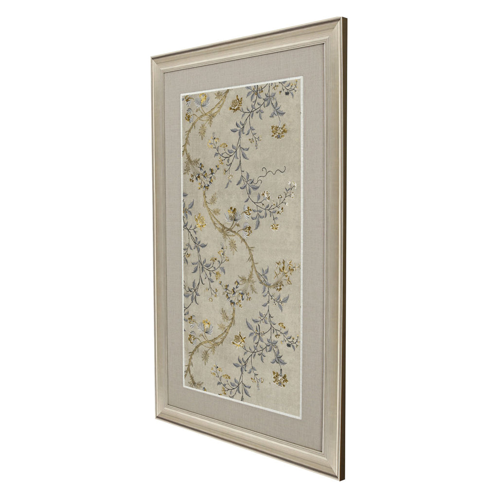 Floral giclee features hand wrapped fabric matting with hand applied decorative papers. Framed in an aged silver modern wood.