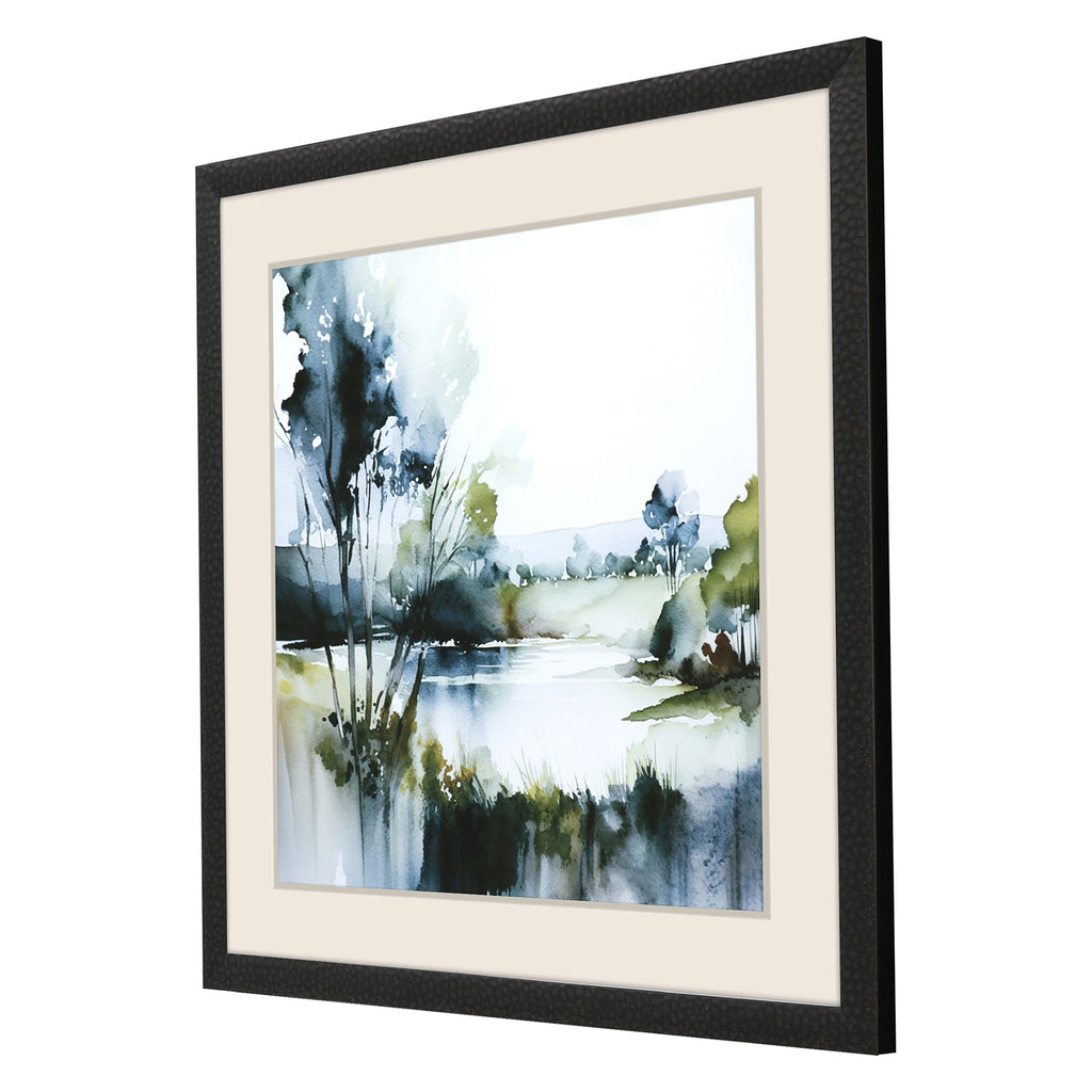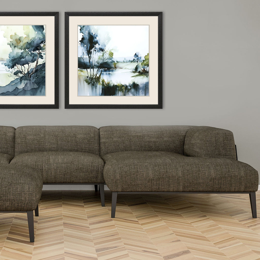 Watercolor landscapes are matted in white. Framed in a modern rubbed matte black wood with honeycomb embossing.