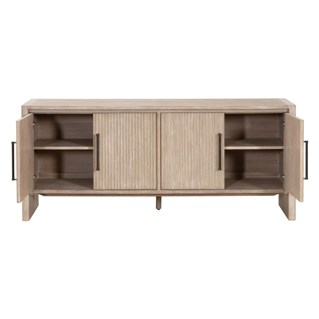 With its transitional design and natural gray finish, this Halloway Media Sideboard by Essentials For Living offers a stylish storage solution that blends seamlessly into both classic and modern interiors. Constructed from solid acacia wood with acacia veneer detailing, it features four reeded door panels that conceal two spacious storage cabinets. Inside, removable and adjustable shelves provide flexible organization for electronics, dishes, and other items you wish to neatly store away. Dual cord management holes keep cables tucked away, while a center support leg adds stability to the 74in wide, 18.5in deep, and 32in high frame, ensuring both form and function. Antique bronze handles finish the look with their timeless charm.