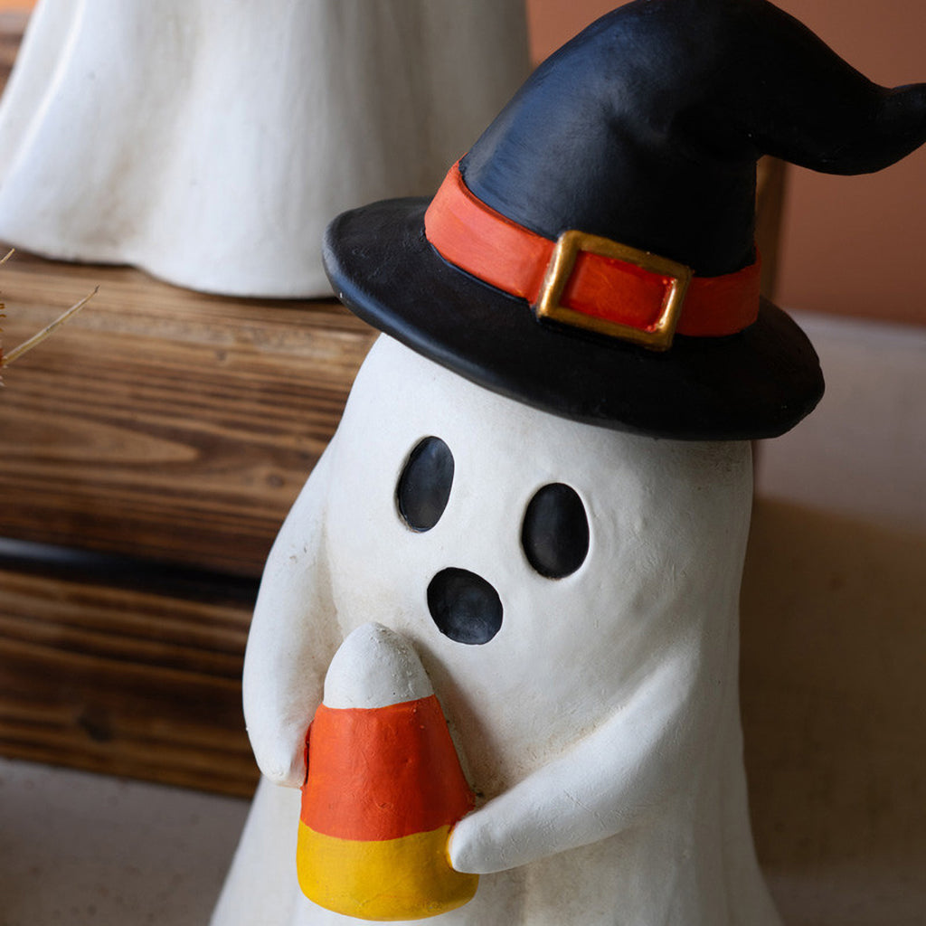 Dress up your decor with this set of two resin Halloween ghosts. One with glasses holds a boo sign and the other wears a witch hat and holds a candy corn. Set these ghouls up to share a spooky thrill.