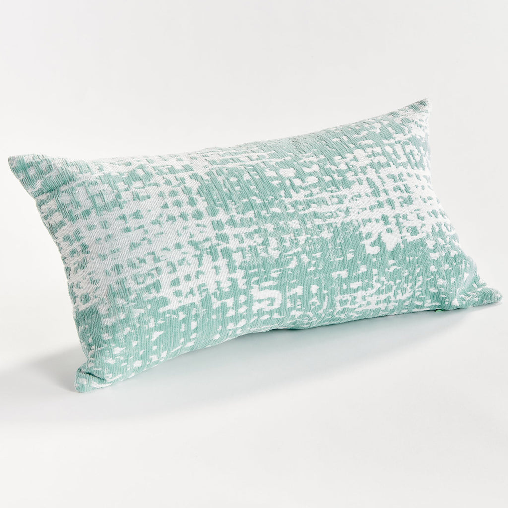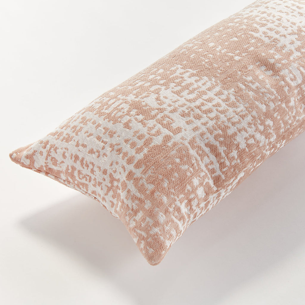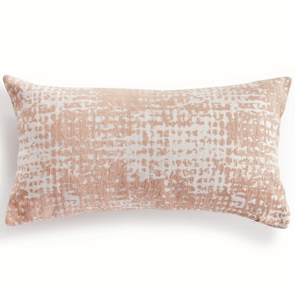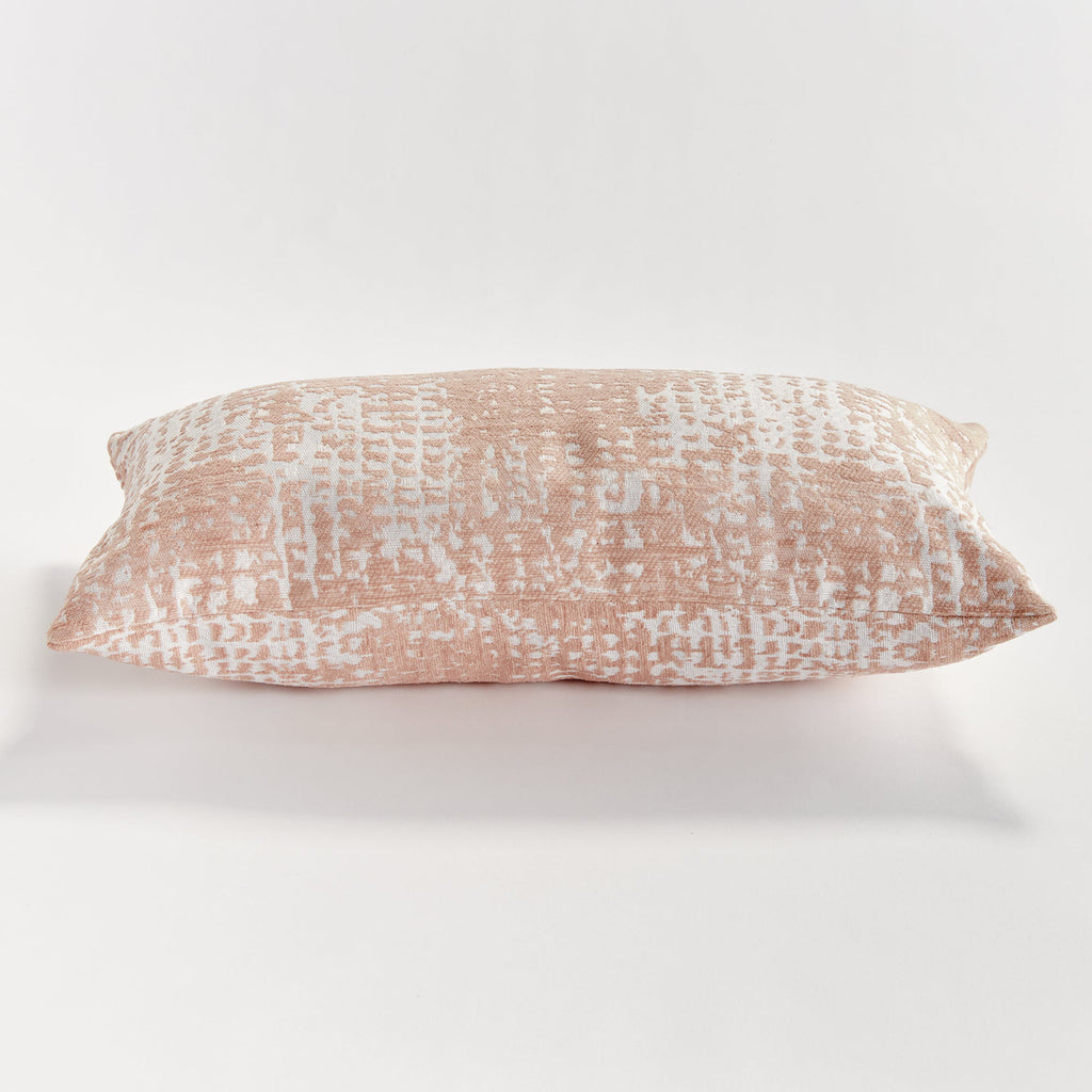 The indoor pillow that lives beautifully outdoors. Enjoy the upscale luxury and durability of Jacquard. With a woven blush and white pattern, it plays well with any palette. This pillow is weather resistant and responsibly made. Filled with 100% recycled fibers.