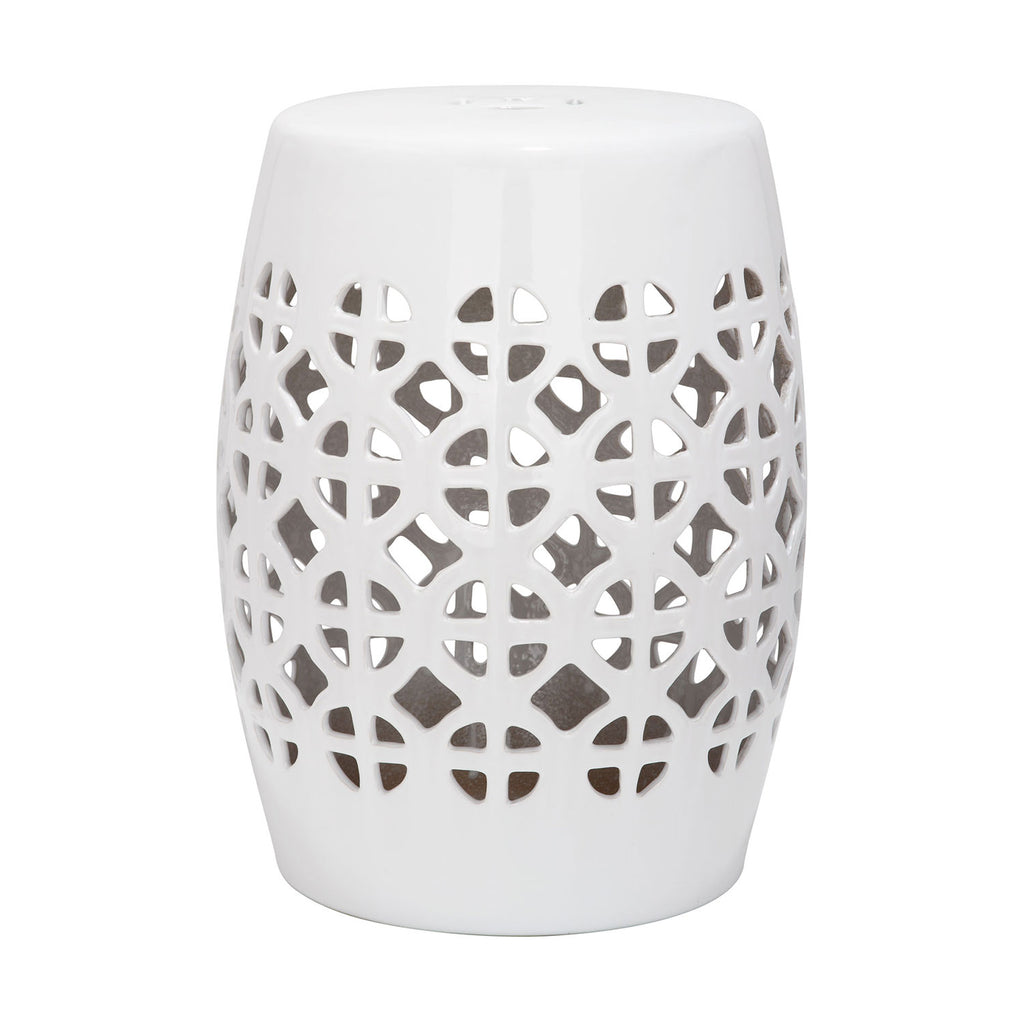 It’s simple geometry: this transitional garden stool’s circle and square lattice brings a chic new look to an ages-old cultural classic. Use this striking accent piece indoors or out; its glazed white ceramic stands up to the elements.