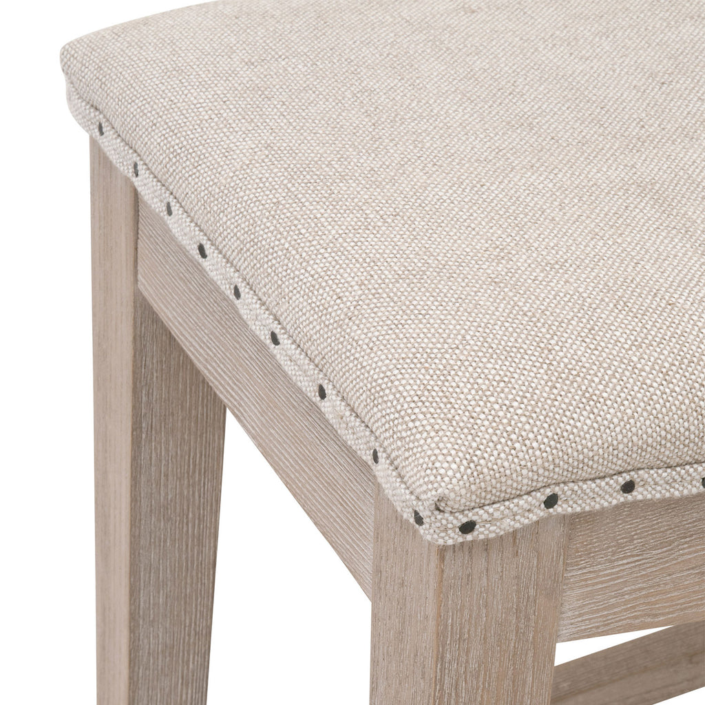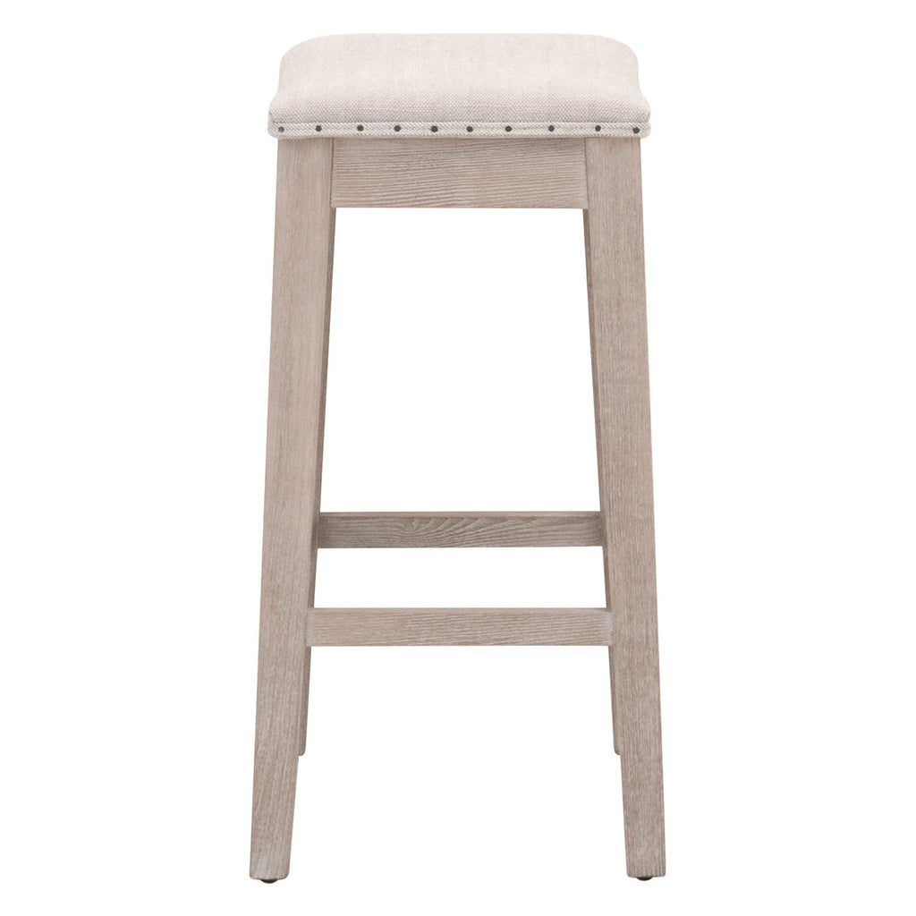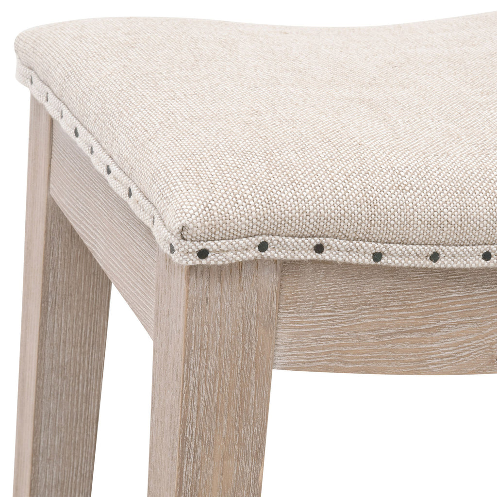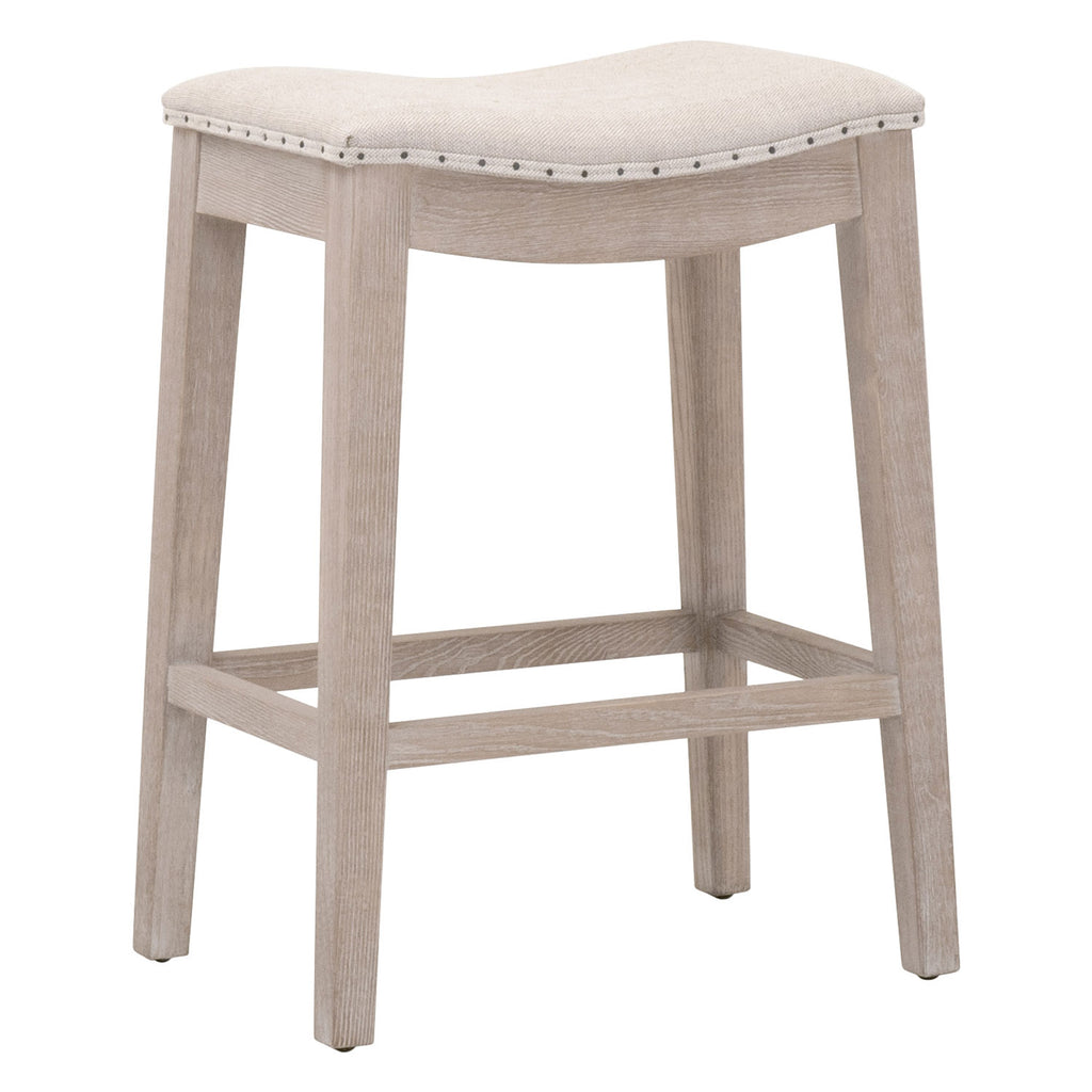 Classy and functional in kitchen and dining spaces, the Essentials for Living Harper  counter stool has a traditional look with a farmhouse feel. The sturdy ash wood legs and four-way footrests feature a natural-looking natural gray finish and a slightly distressed texture. The saddle style seat is upholstered and accented by black nail tacks. If you're looking for a timeless and classic look, then this counter stool will be the perfect addition to any transitional or traditional dining area or bar.Essentials Collection's Fabric finishes made with natural materials feature unavoidable dye lot variation.