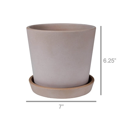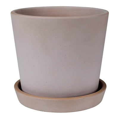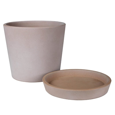 Cast in cement, the pairing of cachepot and saucer in a soft blush hue creates a vessel that will rival the beauty of the foliage it holds. Sized for a 6in drop-in pot.