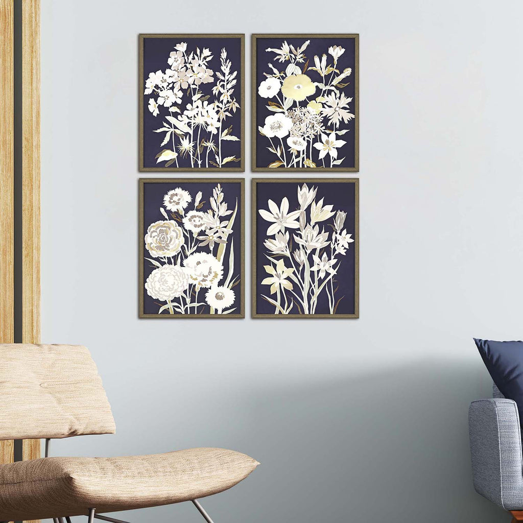 Stylized white florals shimmer against a navy blue background. Framed in an antique gold wood with embossed floral weave pattern. Sold as set of four.