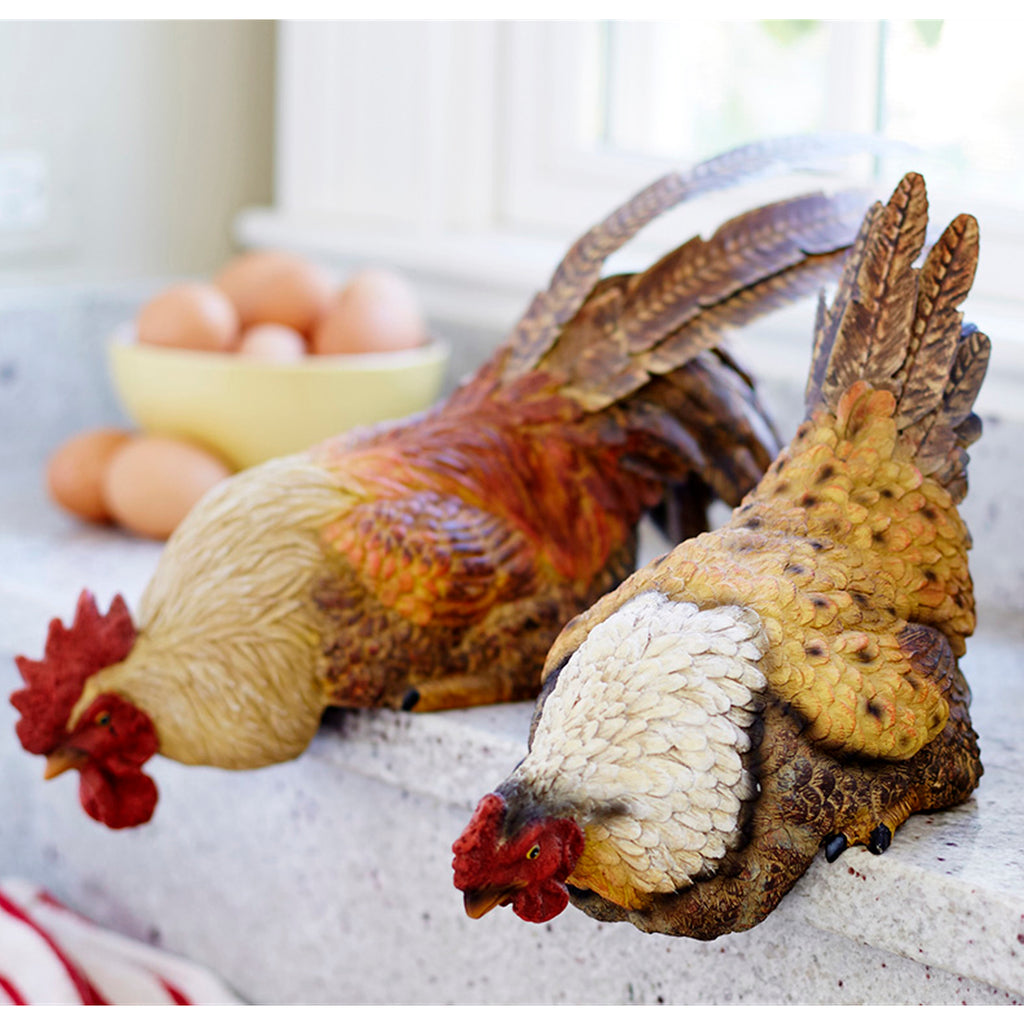 Show off your love for farm animals with this adorable set of Hen and Rooster Shelf Sitters. Featuring two assorted designs, the realistic painted finish paired with the quality carved polyresin composition and metal feather accents is the perfect combination to create a stunning spring display. This set would be a great addition to your country or farmhouse style of decor.