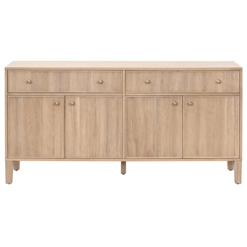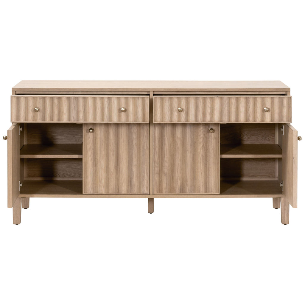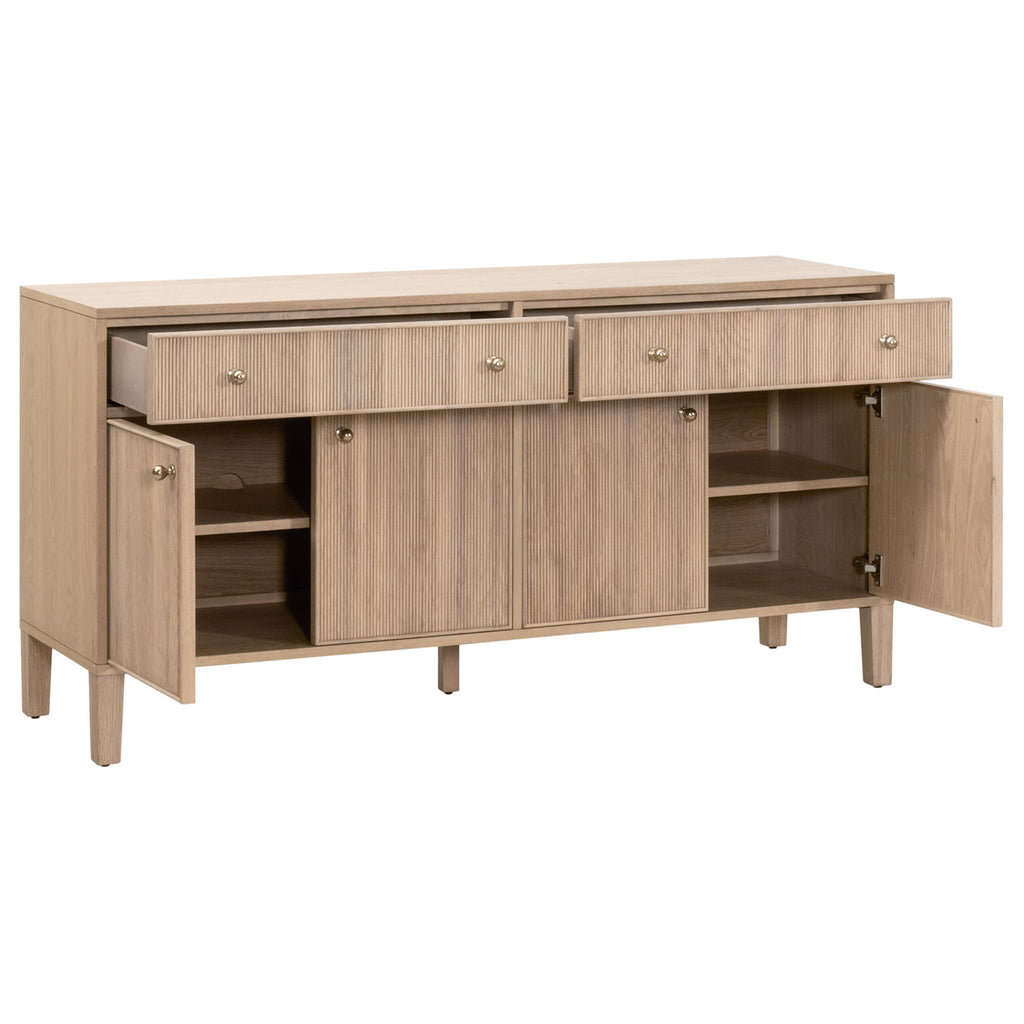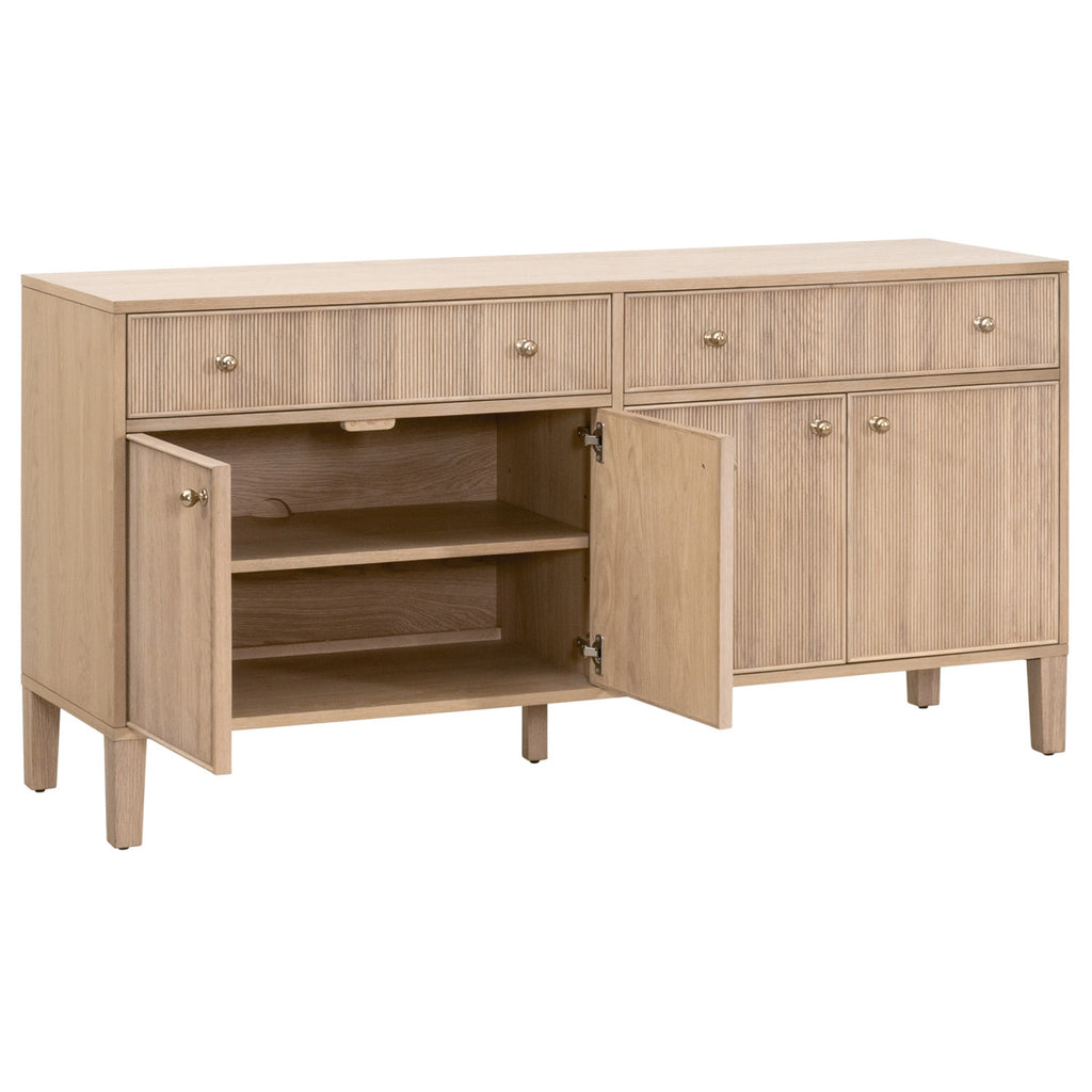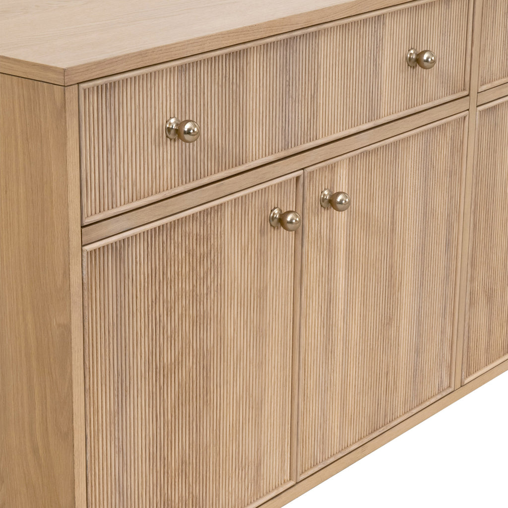 The Highland Media Sideboard by Essentials For Living blends timeless transitional design with functional storage solutions. Measuring 63" wide, 18" deep, and 31.5" high, it features a sturdy solid oak wood and oak veneer frame in a natural oak finish. The fluted wood drawer and cabinet fronts add dimension and texture for a unique design. Each drawer and door are equipped with solid polished brass iron knobs. The felt-lined drawers glide smoothly on soft-close metal tracks, while two spacious cabinets, each with adjustable shelves and cord management holes, provide versatile storage for media or other essentials. Dovetail joinery and KD leg construction ensure lasting durability and stability, making this sideboard both stylish and practical.