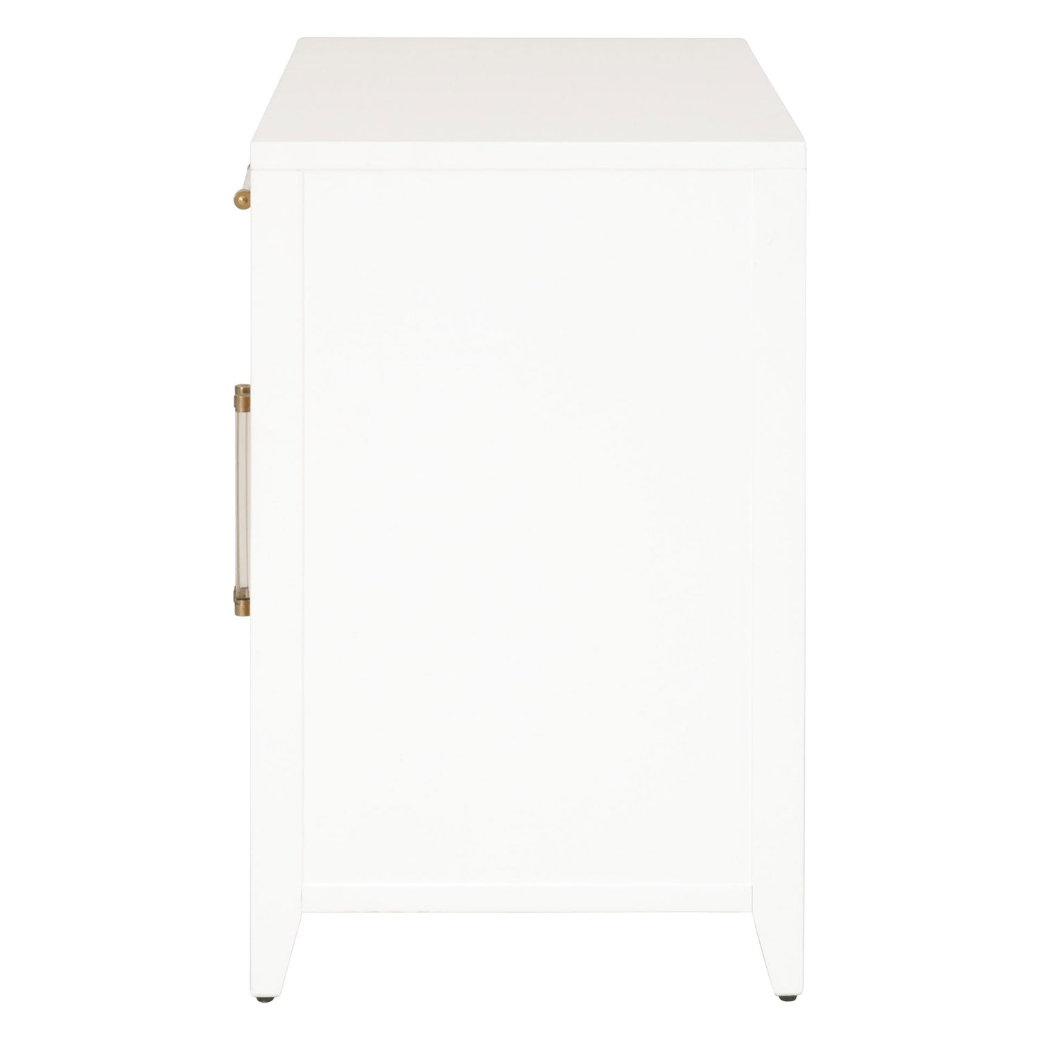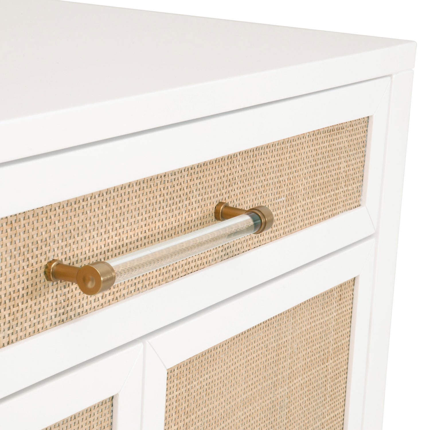 The transitional Essentials for Living Holland media chest nicely blends design styles taken from tropical, traditional, and modern looks. The front drawer and doors feature a natural rattan inlay framed by a brushed black or matte white acacia wood. This bold and natural look will be a long-lasting statement piece for years to come. The interior cabinet conveniently features a cord management hole for electronic devices and an adjustable shelf to reach your desired height. The modern-looking clear handles with brushed brass ends uniquely accessorize this media cabinet as well. This versatile piece is more compact than most media sideboards and entertainment centers, making it an ideal fit for smaller spaces. Tradition Collection's Natural Rattan finish is a natural material that includes unavoidable variation in color, texture, blemishes and marks. These features are not defects, but rather the material's natural characteristics.
