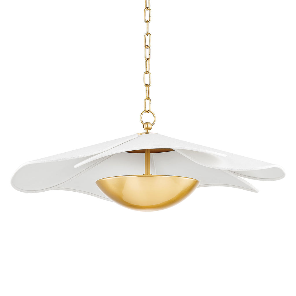 High-quality and exceedingly creative, Mitzi delivers a semi-nostalgic classic lighting collection with streamlined contemporary elements that instantly upgrade your space. Suspended from the ceiling, pendant lighting by Mitzi offers extra light expression exactly where you need it with a functional high-design feel. Flowing, petal-shaped, off-white linen shades and Aged Brass accents add a subtle natural style overhead that feels chic. The flush mount lights the shade from within, while light fills the metal bowl and shines upward to illuminate the pendant's linen shades from underneath.