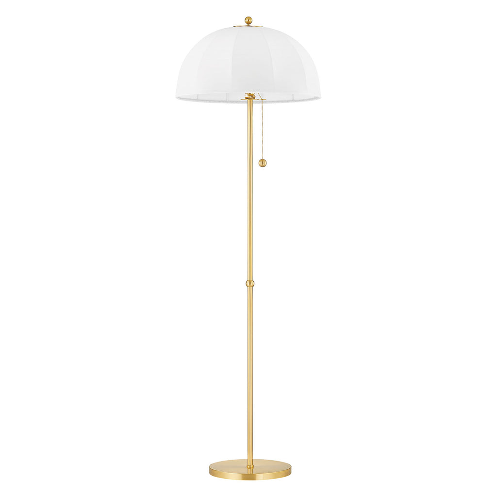 High-quality and exceedingly creative, Mitzi delivers a semi-nostalgic classic lighting collection with streamlined contemporary elements that instantly upgrade your space. Texturize and illuminate your space with a floor lamp by Mitzi, which positions and diffuses light higher in your living room or office while de-cluttering with sleek form. Inspired by mid-century Danish design, Meshelle features a whimsical umbrella shape. Light flows both through the shade and softly glows around it. Aged Brass accents on the finials, chain detailing, and the floor lamp's pull chain, add a sophisticated touch to this usable fixture.