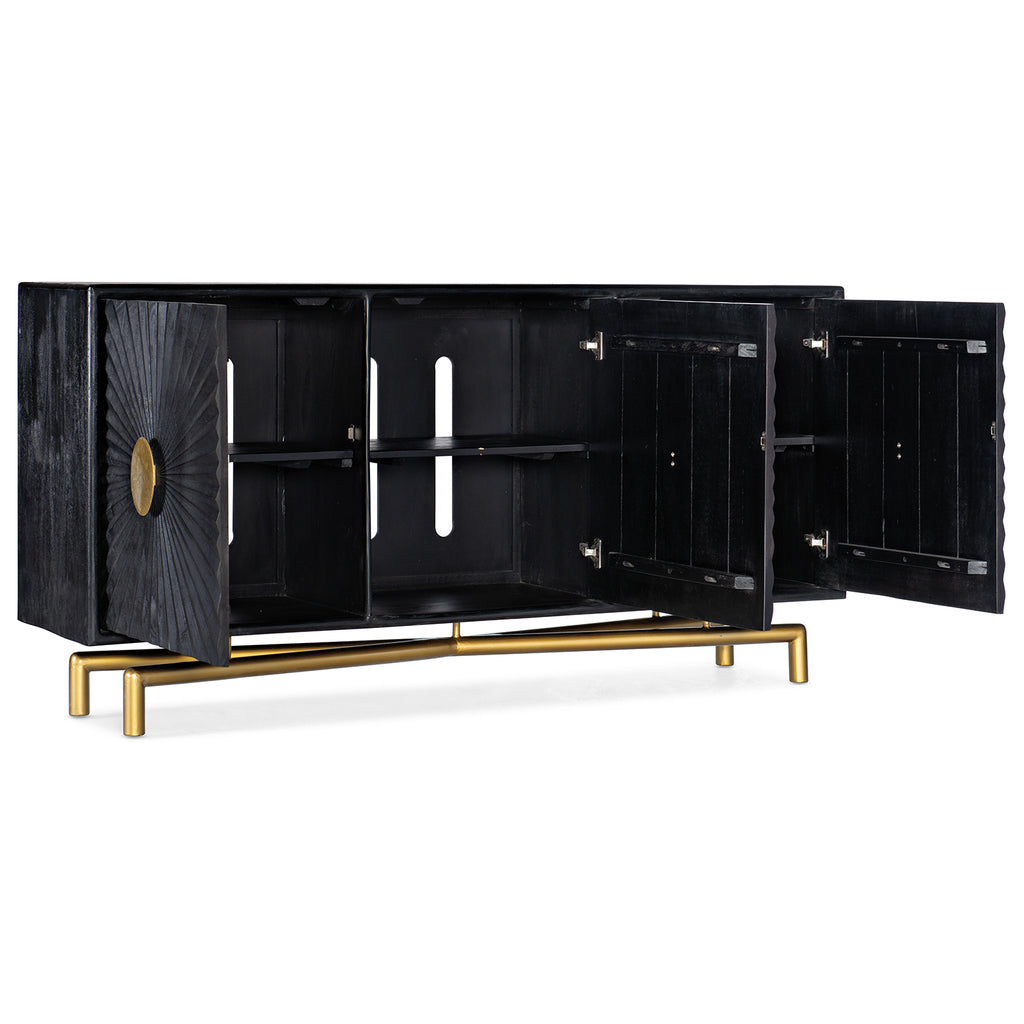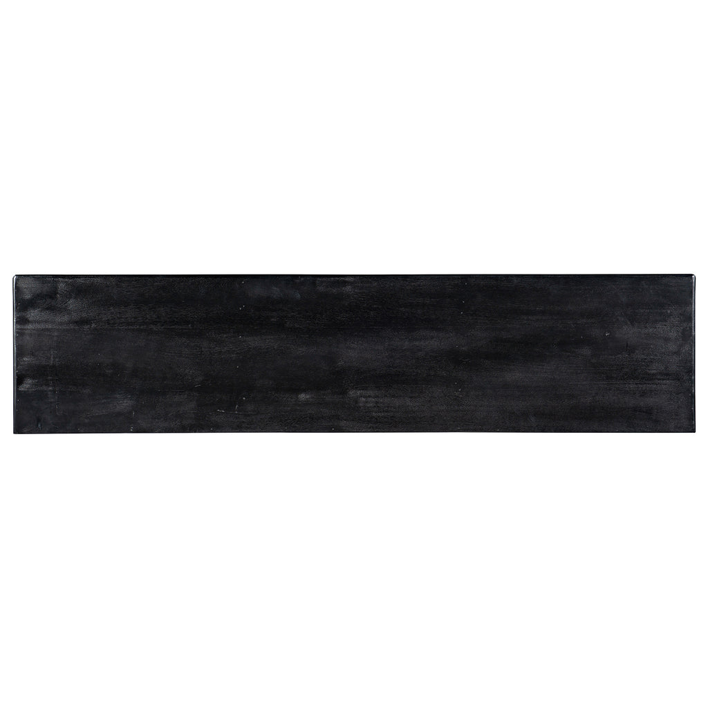 Sleek style and a classic black and gold color scheme come together to create a stunning piece in this 69in entertainment console. Crafted of Mango Wood with a gold-finished iron base, it features a rustic black finish accented by generously scaled oval-shaped, hammered gold metal hardware.