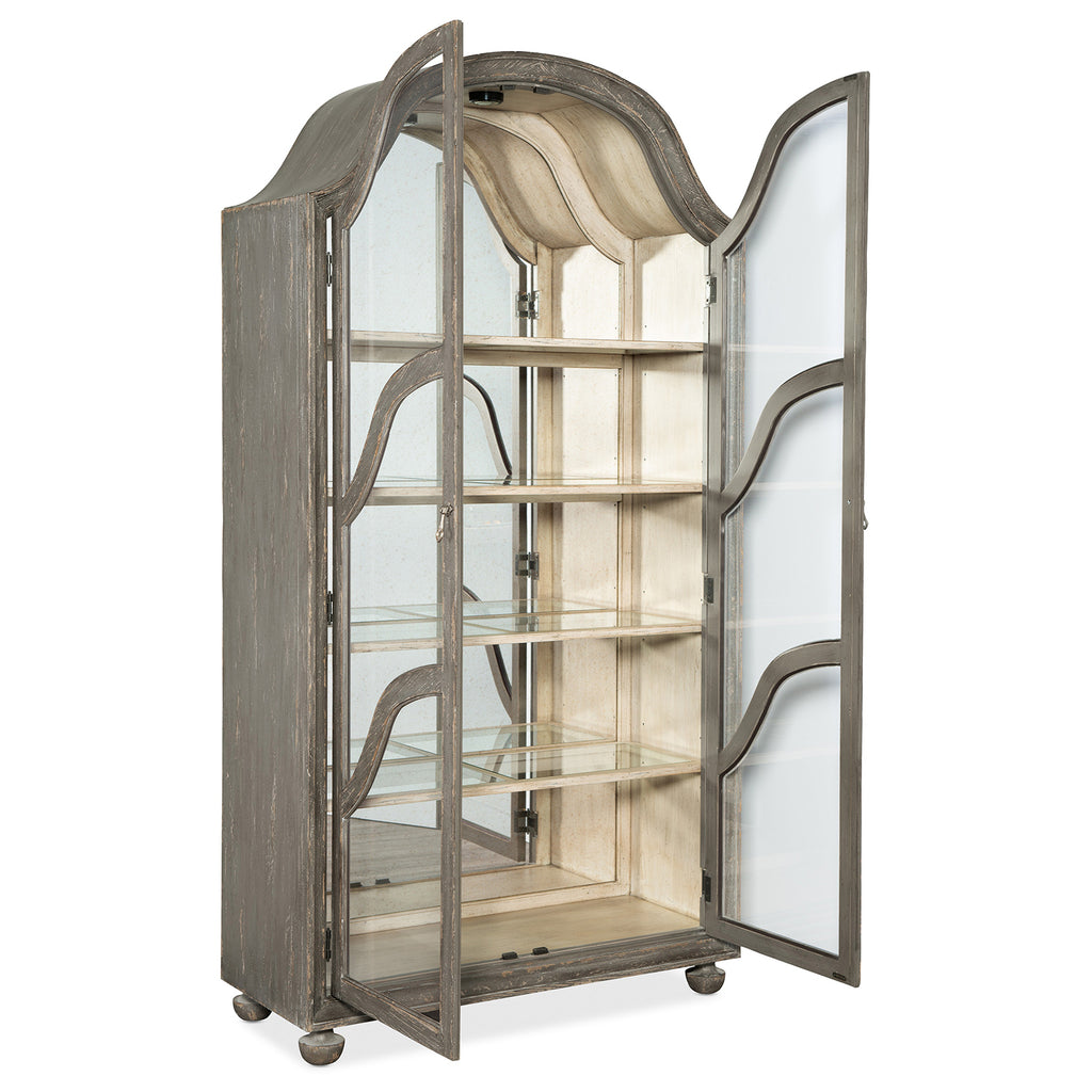 Create a functional focal point of casual opulence with the arched-top Costa Display Cabinet that is grand, yet charming and approachable. Finished in a rich and earthy Pottery, or dark gray, color, the Costa Cabinet sparkles with a touch of glam, featuring an antique glass back panel and teardrop pendant hardware with dogwood flower backplates in hand-hammered Florentine gold. the two wood-framed glass doors are four adjustable wood-framed glass shelves, and each shelf has one plate grove. A touch-switch light is on top of the right hinge.
