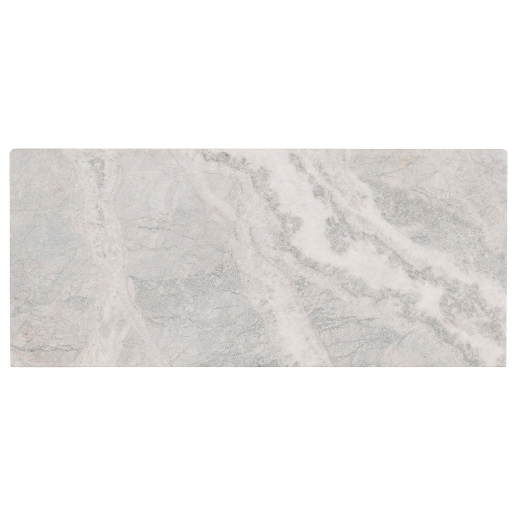 The modern yet casual style of the Amani Chest evokes a place of refuge and retreat with its tranquil mix of natural materials. The case is crafted of Pecan, Maple and Oak Veneers with a Crema Marble top. The tactile Brie finish is a Gray tone with organic reeded details and a diamond pattern on each of the three drawer fronts. Silver-colored tab pulls add a sparkle.