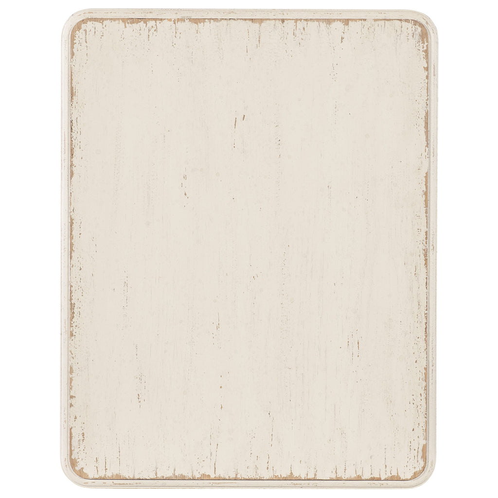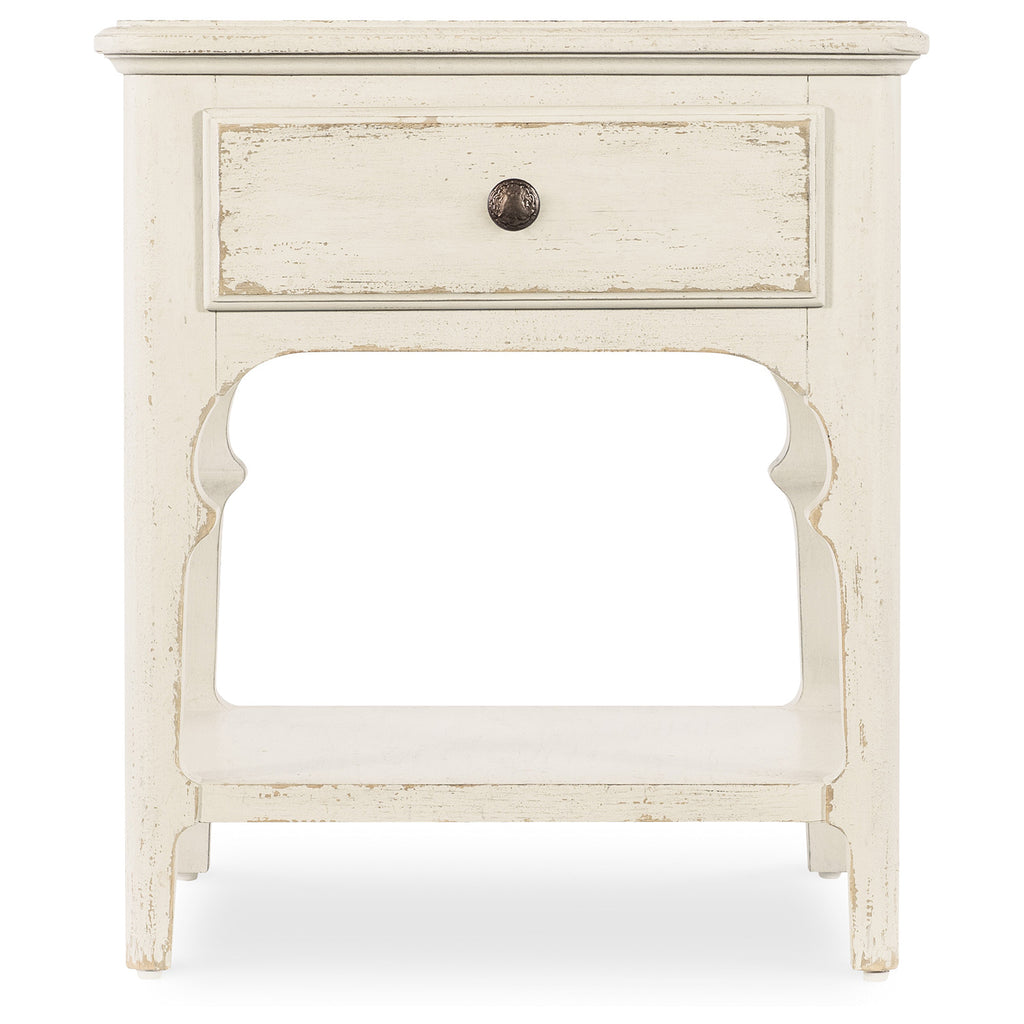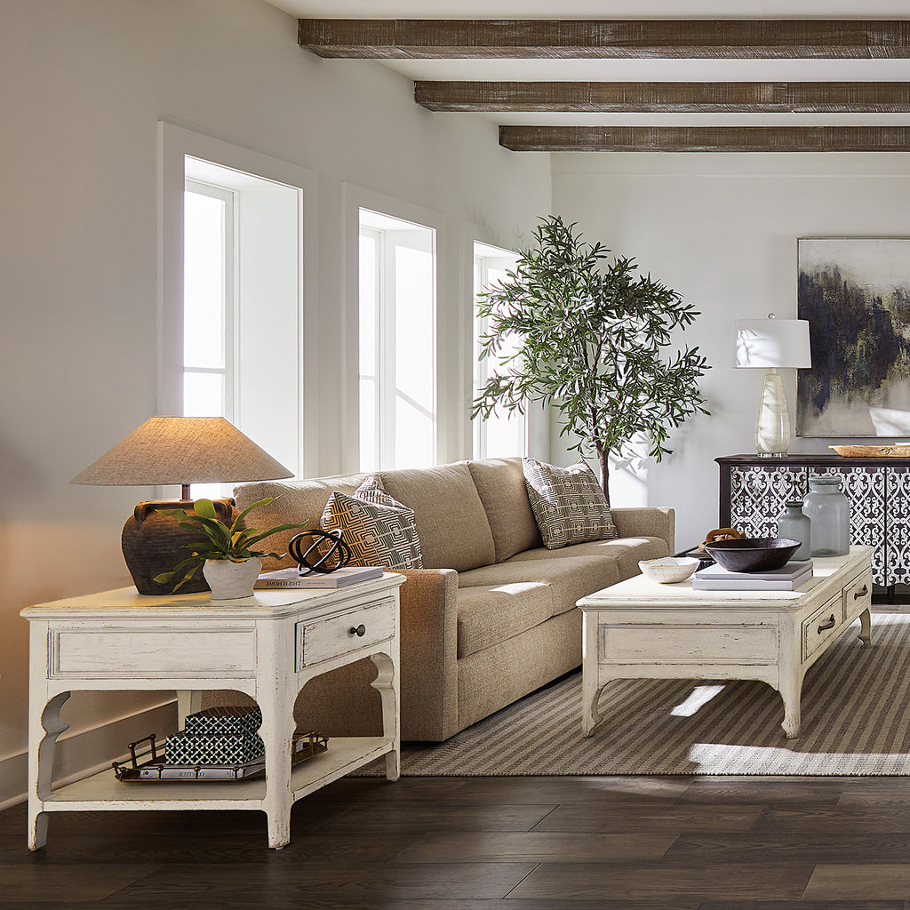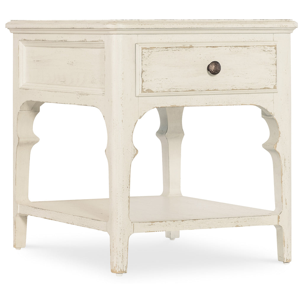 In a classic, charming design with a nostalgic flair, the square-shaped Americana End Table has scalloped shaped legs and is finished in the time-worn white Daisy over Cathedral Oak Veneers. The finish represents the natural wear one might expect of pieces passed down through the family over time, revealing the rich oak character beneath. The table has a Solid-Wood Edge top, one self-closing drawer with drawer interiors in the Honey finish, one fixed shelf and metal alloy bar pulls in an antique bronze finish.