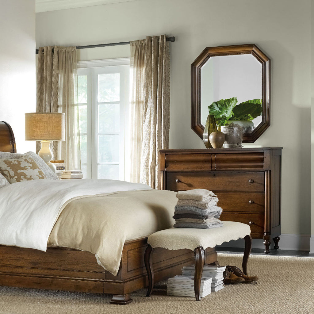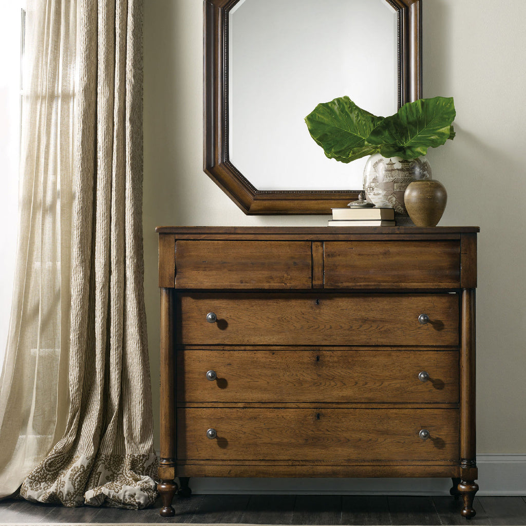 Make your bedroom a cozy retreat for movies at midnight with the TV and media-ready Archivist Bureau featuring a drop-down drawer to accommodate wire management and component storage. Inspired by epic European and American style elements, the bureau is comfortable and inviting with a world-traveled pedigree. Five drawers with the top left drawer offering a ventilated back and a front that flips back for component usage. The top right drawer is felt lined with a jewelry tray, and the bottom 3 drawers have 2 removable dividers. The bottom drawer is cedar lined. Featured in a soft casual finish over Pecky Pecan Veneers for a rustic, authentic look.