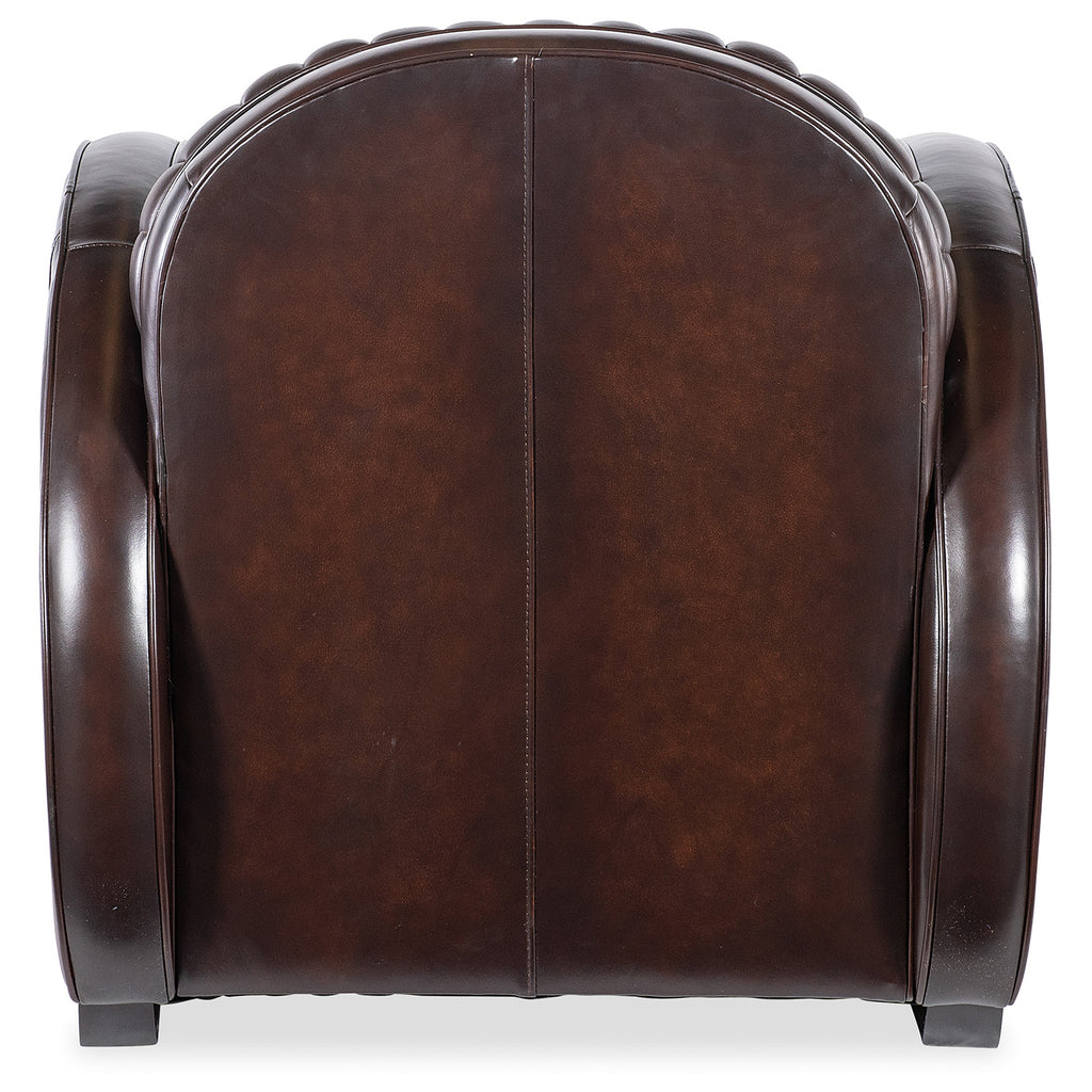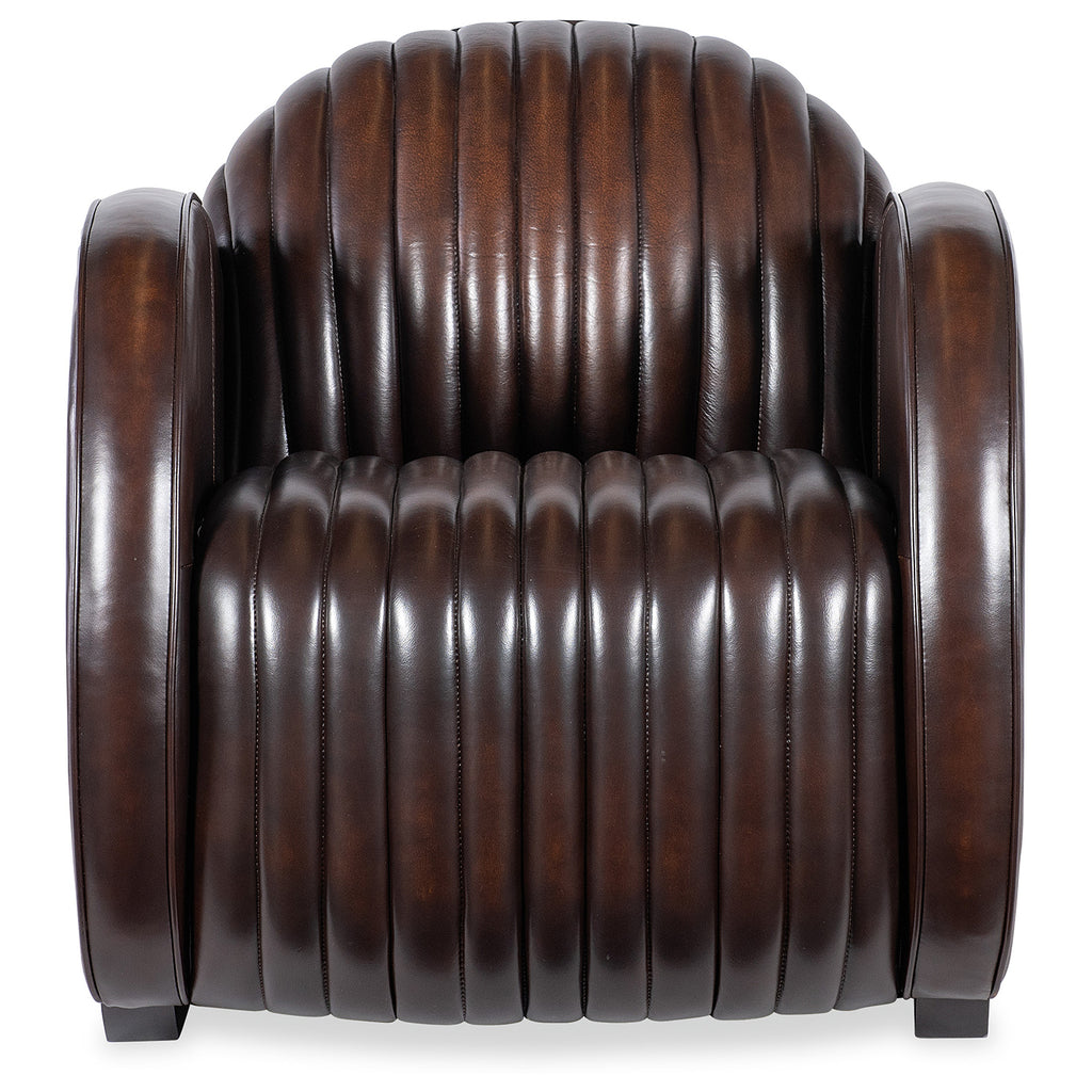 In a bold modern design with an Art Deco flair, the Banks Chair has a plush channeled back and seat and rounded track arm style with wood sled feet. Welt and topstitch trim adds an upscale feel, along with the Vortex Semi-Aniline Top Grain Leather leather.