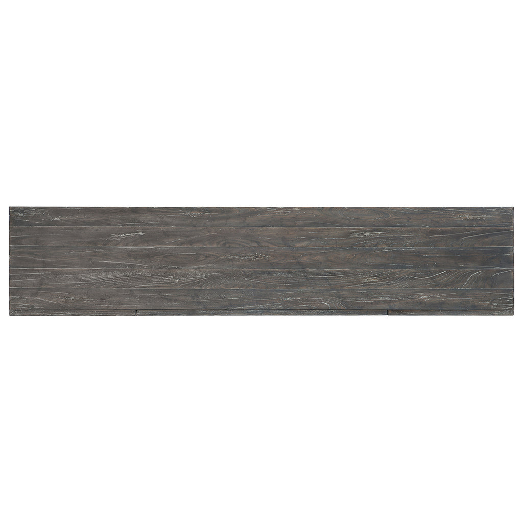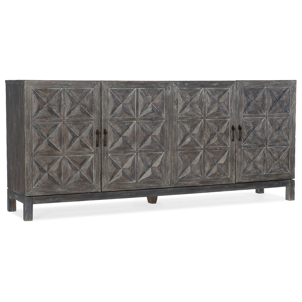 With a raised graphic pattern on its door fronts, mottled copper hardware and a soft Gray Shale finish with natural wood undertones, the Beaumont Entertainment Console has a chic Made indiaustrial vibe that fits interiors from classic to modern to Bohemian. Accommodating an 80-inch TV, the entertainment center has one drawer and one adjustable shelf behind each pair of doors.