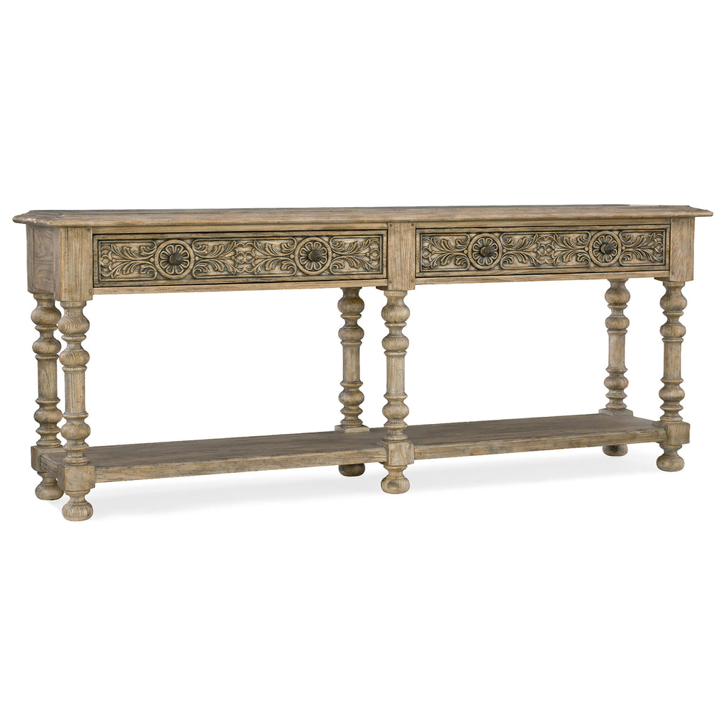 The striking Bexar Leg Huntboard is crafted in a carved gambel oak motif inspired by the scrub oaks that are prominent in the American West. The Sandstone finished with characteristic aged black highlights is reminiscent of the sandstone quarried in Texas Hill country for centuries. The huntboard has one fixed wood shelf and two drawers.