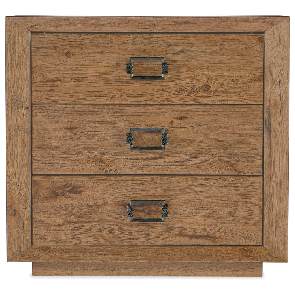 With an American West vintage charm, the Big Sky Nightstand has a straightforward silhouette design crafted of Pecky Hickory Veneers with a solid-wood edged top. Finished in the warm and rustic Vintage Natural, the piece is accented by dark brushed bronze pulls in a buckle style. With three self-closing drawers, the top drawer has a removable felt liner. There’s a power supply and a cord clip on the back, and the bottom drawer is cedar-lined.
