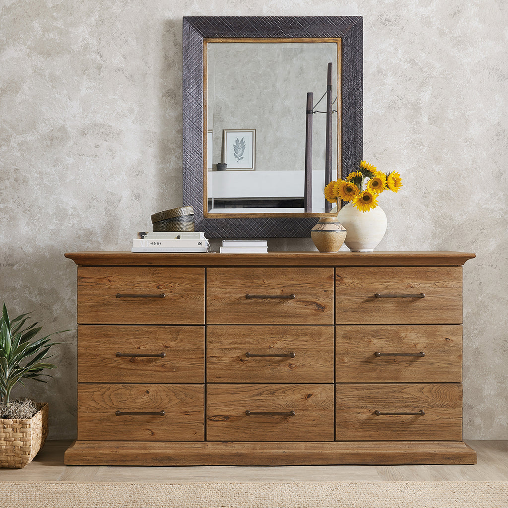 With a clean, simple silhouette, the Big Sky Nine-Drawer Dresser exudes the authenticity of open spaces in the American wilderness. Crafted of Pecky Hickory Veneers and Cedar with a solid-wood edged top and moulding on the base and top, the chest is finished in the warm Vintage Natural.