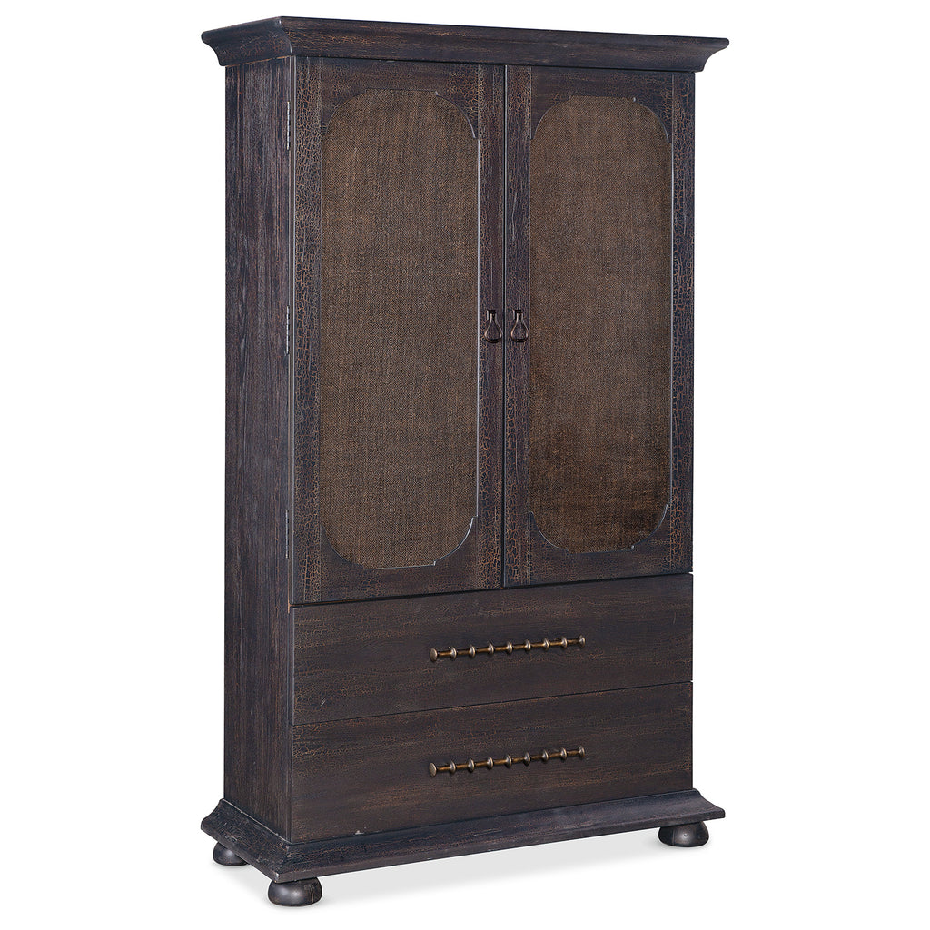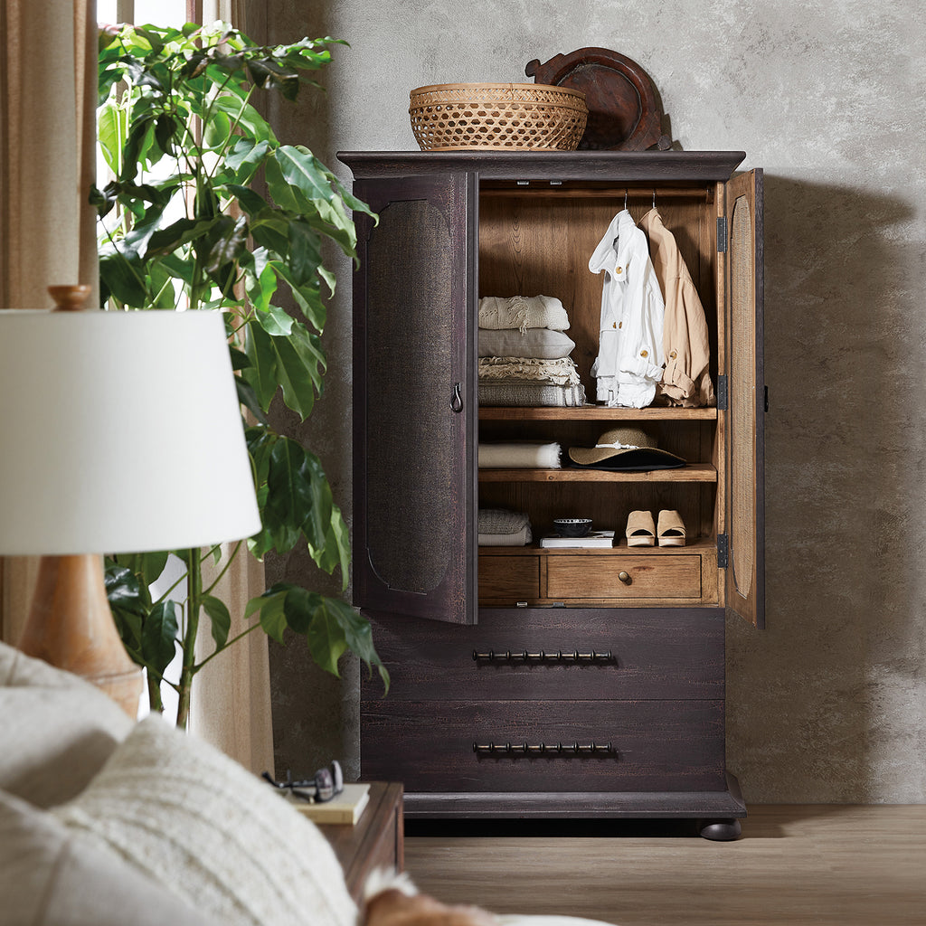 With a tactile appeal and a vintage design, the Big Sky Small Wardrobe is striking in a black Charred Timber finish over Pecky Hickory Veneers contrasting with finished burlap on the door fronts. the two doors is one removable clothes rod, two adjustable shelves and four self-closing drawers. Accented by dark brushed bronze bar pulls and chic bun feet.