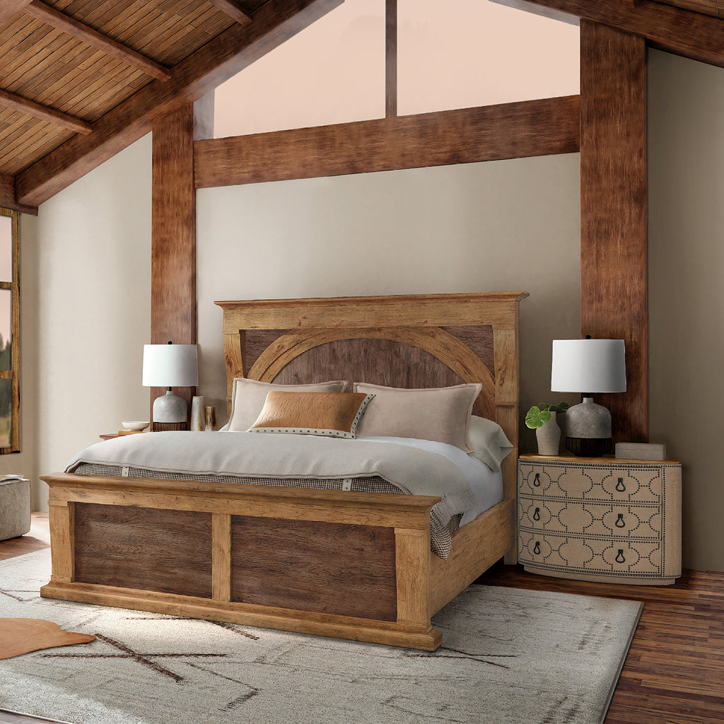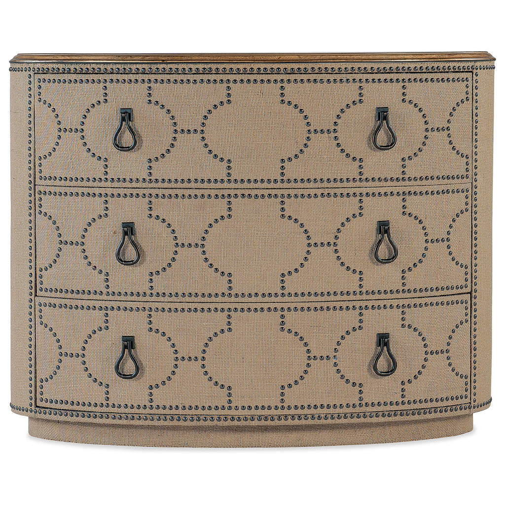 Vintage and tactile with a chic flair, the Big Sky Three-Drawer Chest combines a Pecky Hickory Veneer solid-wood-edged top in a Vintage Natural finish revealing the authentic knots and wood grain with a burlap-wrapped case accented by a patterned nailhead design. With three self-closing drawers, the top drawer has a removable felt liner and the bottom drawer is cedar-lined.