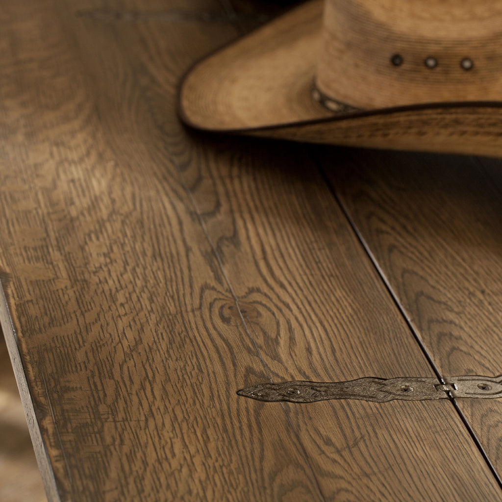 Be transported to the wide vistas and rustic elegance of the American West with the  Flip-Top Console. Three custom made hinges are featured on each side to support both sides of the top that folds down so this table can be used as a sofa table, hall table, extra dining table or a writing desks. There are two drawers and two pull-outs for added support. Finished in a time-worn saddle brown.