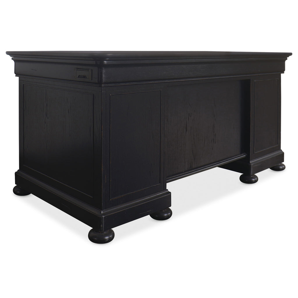 Casual yet refined and stylish, the Bristowe Computer Credenza sets a professional and inviting tone for any work-from-home space. Crafted of Pecan Veneers in a Tuxedo black paint finish with touches of warm brown, the desk is accentuated by oil-rubbed bronze-finished ring hardware and chic bun feet. Offering 7 drawers, the top left and right drawers are on full extension metal ball bearing slides with removable divider inserts. There’s one removable writing slide and one removable pencil drop-in that can be used on either side. The bottom drawers are locking file drawers with a pendalfex filing system and full extension metal ball bearing slides. The center drop-front drawer allows for keyboard use. Finished on all sides, so the desk can float in a room.