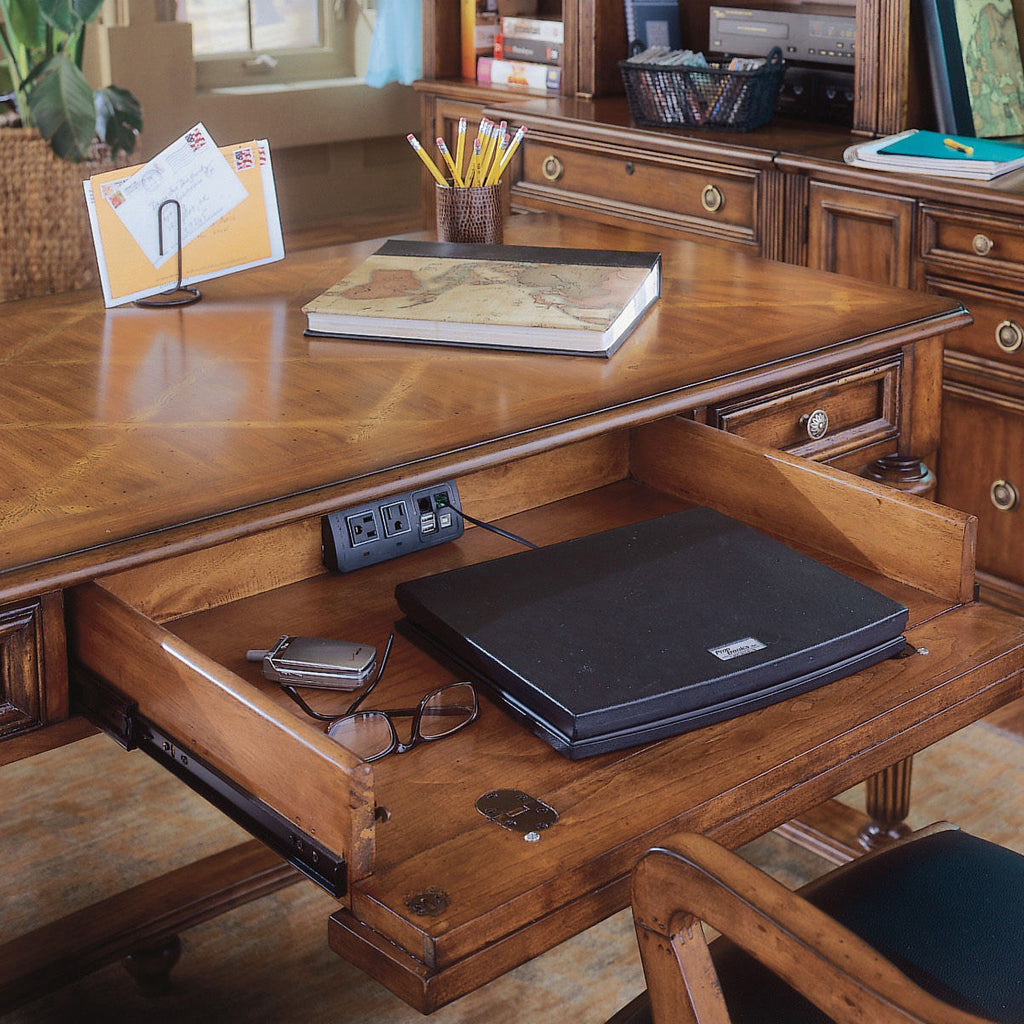 Vintage and versatile, the 60W-by-30D Brookhaven Leg Desk is perfect to tuck a sofa, in a kitchen, extra room or office as a work-at-home solution. With timeless Americana style details like a distressed medium clear cherry finish over Hardwood Solids and Cherry Veneers, fluted legs and a curved stretcher, the Brookhaven Leg Desk says you’ve arrived. The center drawer has a drop-front for use with a keyboard, 2 utility drawers and a power supply.