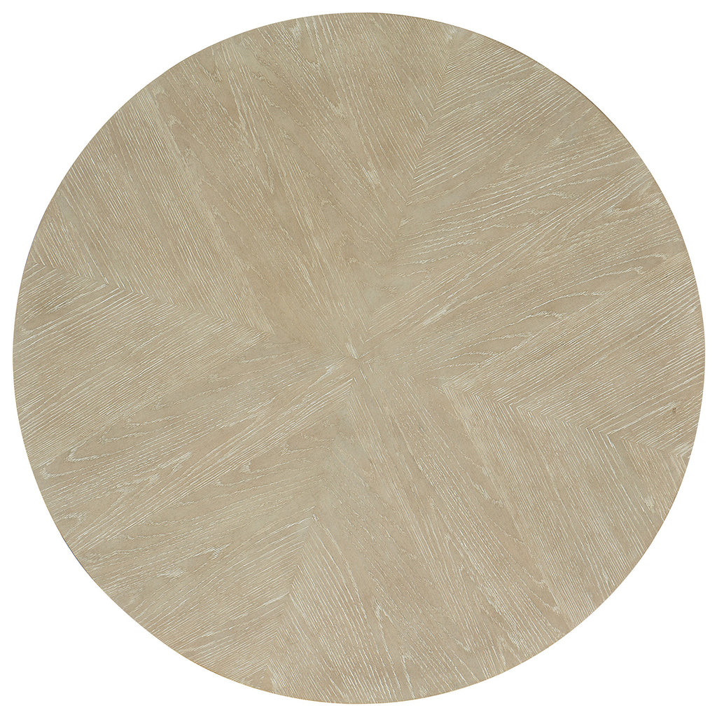Inject a sense of calm and tranquility into you living space with the soft and stylish round-shaped Cascade Cocktail Table combining Oak Veneers in a tactile taupe finish with dry brushing and a champagne-colored metal base to add a touch of sparkle.