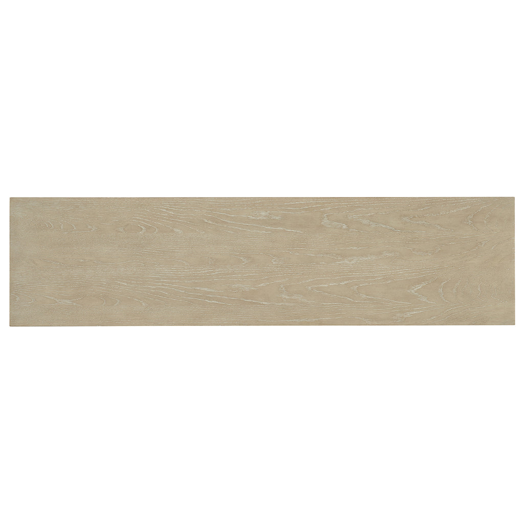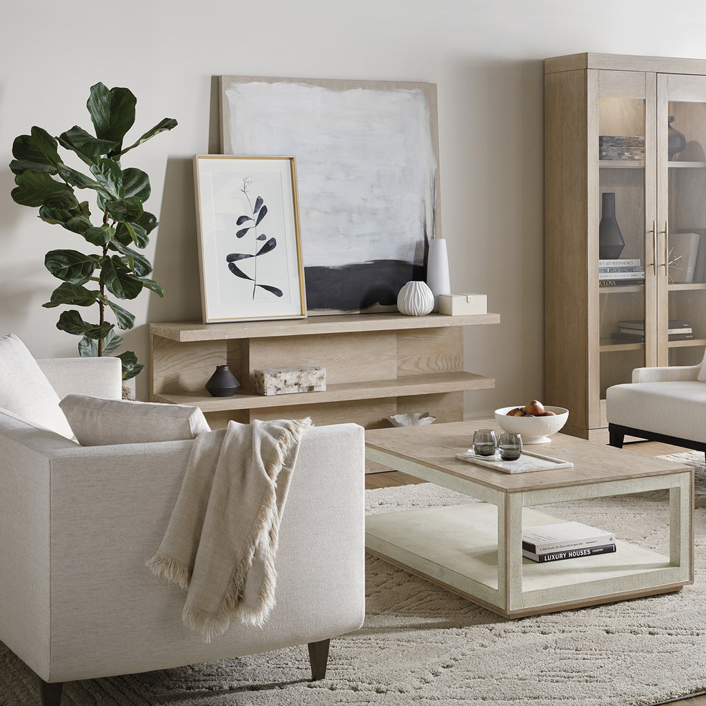 Clear the clutter and bring a sense of calm and tranquility to your home with the dual-function Cascade Console Table. At only 14 inches deep, this piece can fit in small spaces and can serve as a bookcase or display case while also serving as a sofa table, hall table or bedroom piece. The organic Terrain finish is a soft taupe color on oak veneers with dry brushing.