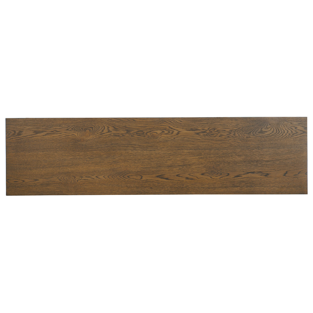 Craftsman style gets a casual modern twist with the Chapman Buffet, constructed of White Oak Veneers with a warm brown Sorrel finish revealing the woodgrain and a refined decorative veneer pattern. Custom hardware in a forged pewter finish is complemented by a thinly-scaled metal base and stretcher. Featuring 4 doors with soft-close hinges, there is one drawer and one adjustable shelf behind each pair of doors, and the left drawer has a removable felt lined silverware tray. Ventilated back panel.
