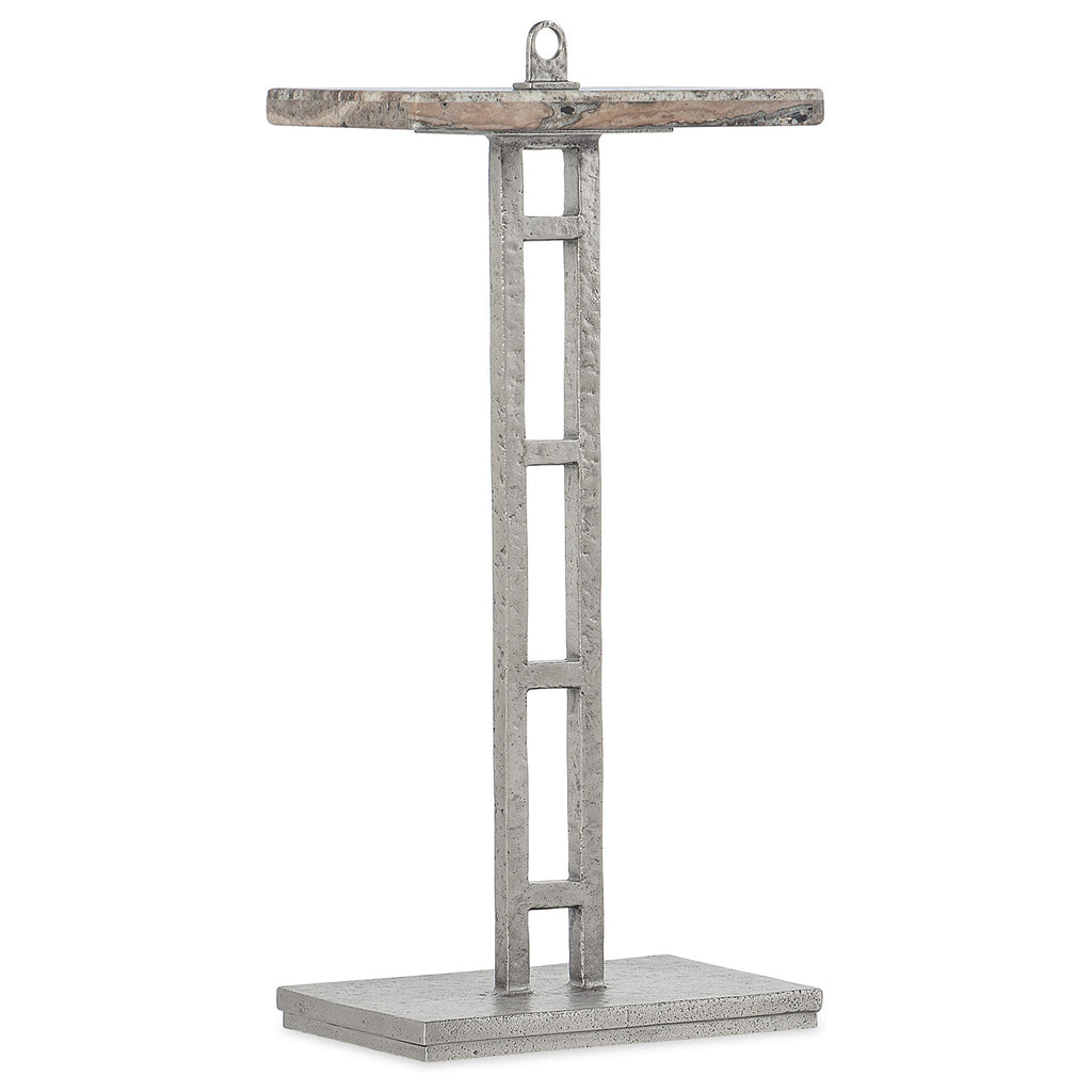 Organic meets industrial in the Chapman Drink Table combining a hand-hammered forged pewter base in a simple geometric design with a honed silver travertine stone top in a compact footprint, making this piece versatile for a variety of spaces.