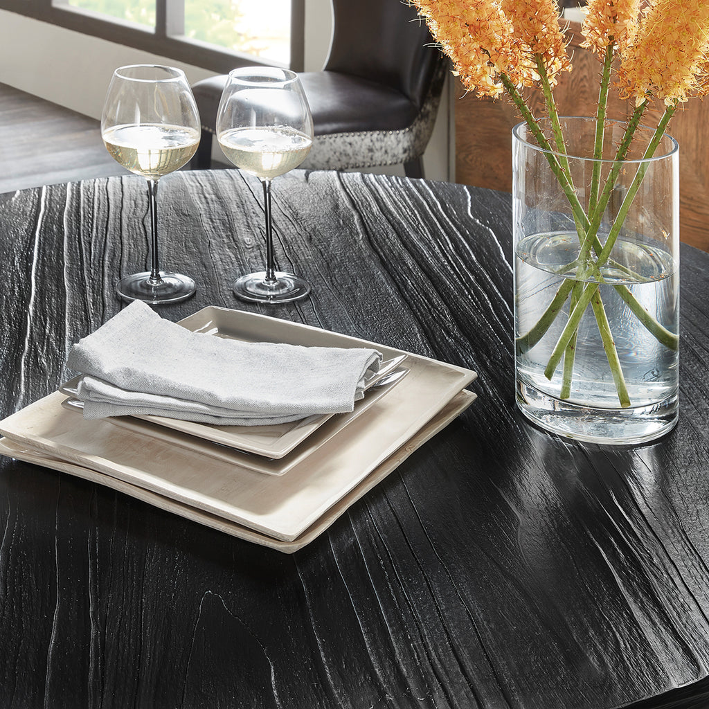 In a chunky and chic silhouette, the Chapman Round Dining Table is casual with a modern twist and features a Charred Black finish on Pine Veneers, a Japanese technique to achieve the look of burnt wood. Will accommodate up to 6 chairs.