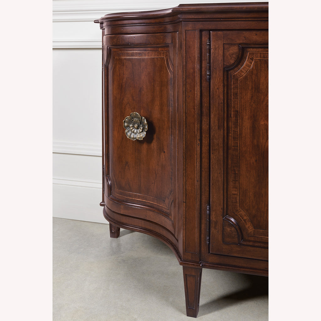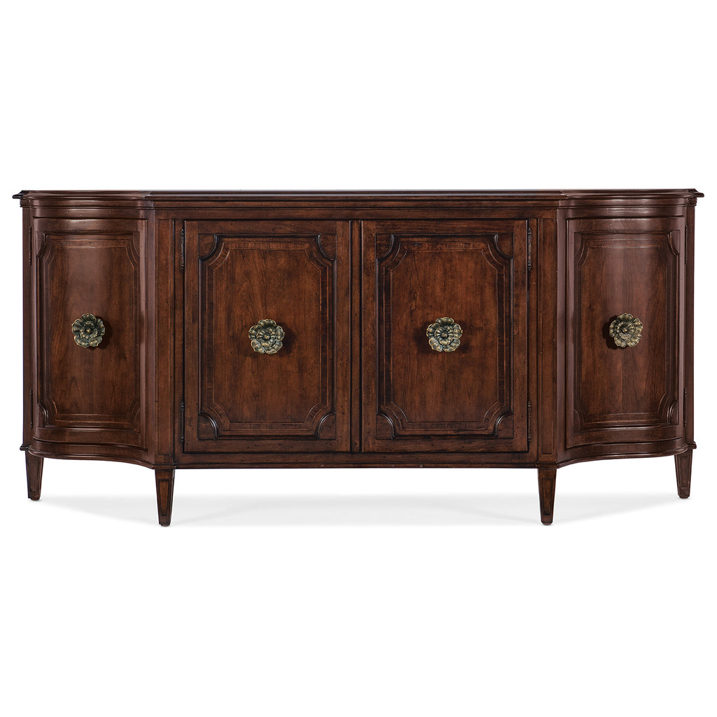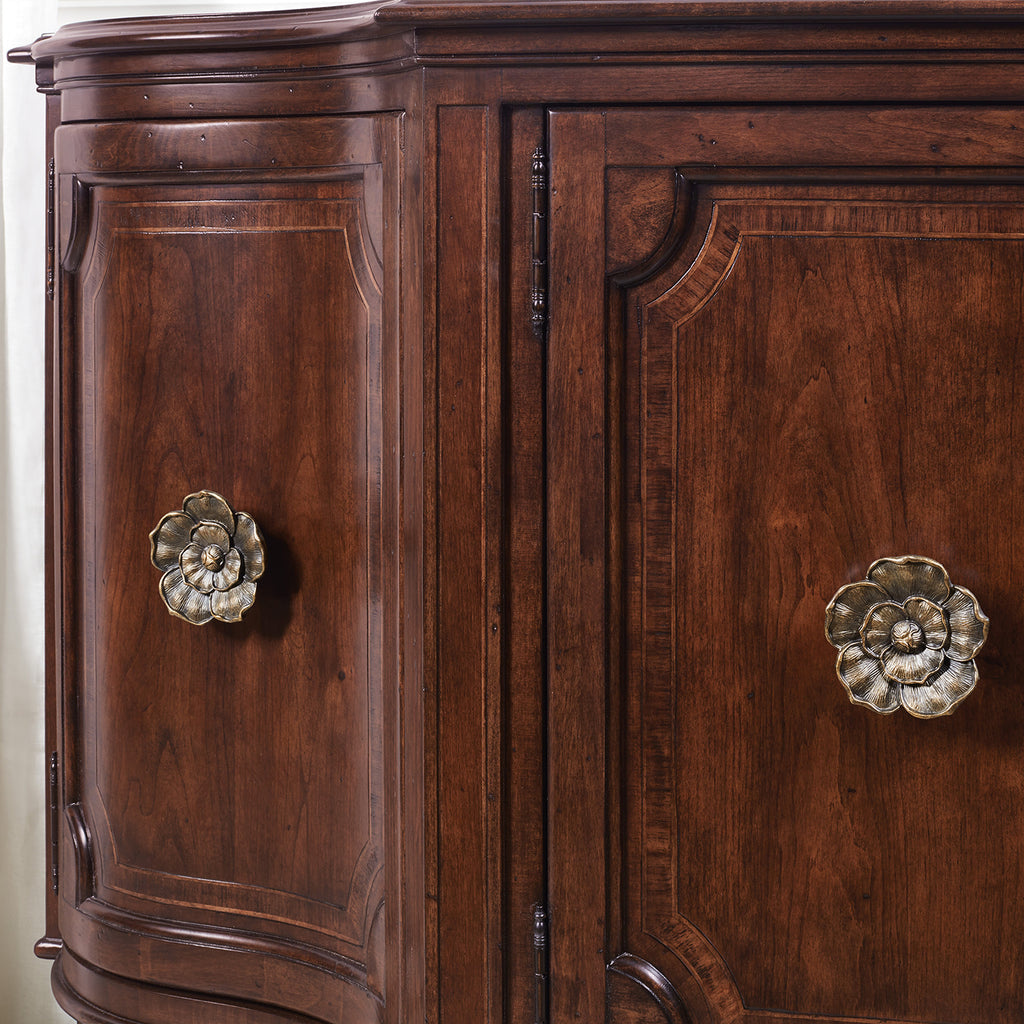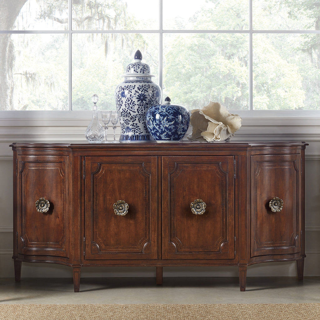 Heirloom quality meets a fresh traditional design interpretation and modern functionality in the Charleston Four-Door Buffet. Crafted of Cherry, Maple and Walnut Veneers with exquisite Maple Inlay and a Solid-Wood Edge top, the buffet is finished in the vibrant Maraschino Cherry, finished using natural grain Cherry Veneers showcasing the dramatic cathedral structure with the selective inclusion of naturally-occurring knots to deliver a rich warm cherry finish and smooth sophisticated aesthetic. the two center drawers is one self-closing tray drawer and one adjustable shelf. the left and right-side doors is an adjustable shelf, and there’s a removable felt-lined silverware tray in the drawer. The custom magnolia floral decorative pulls in an antique bronze color add a sparkle of beauty.