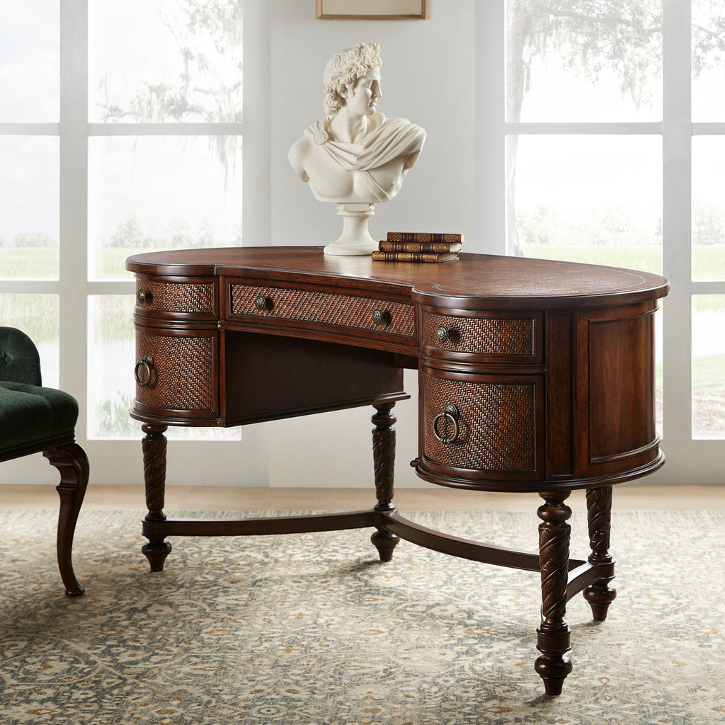Inspired by the tropical craftsmanship of the West Indies and classic British and Dutch Colonial design periods, the Charleston Writing Desk has a timeless kidney shape, stretchers, rattan drawer fronts, intricately-carved leaf motifs on the legs and a robus leather writing surface top. Crafted of Cherry Veneers, Rattan and Resin, it is finished in the deep, rich Maraschino Cherry. There are five drawers. The left and right top drawers have one removable partition, one writing slide and pencil tray for use in either drawer. The center drawer has a drop-front for keyboard use. Antique bronze round knobs and ring-pull hardware add the finishing touch.