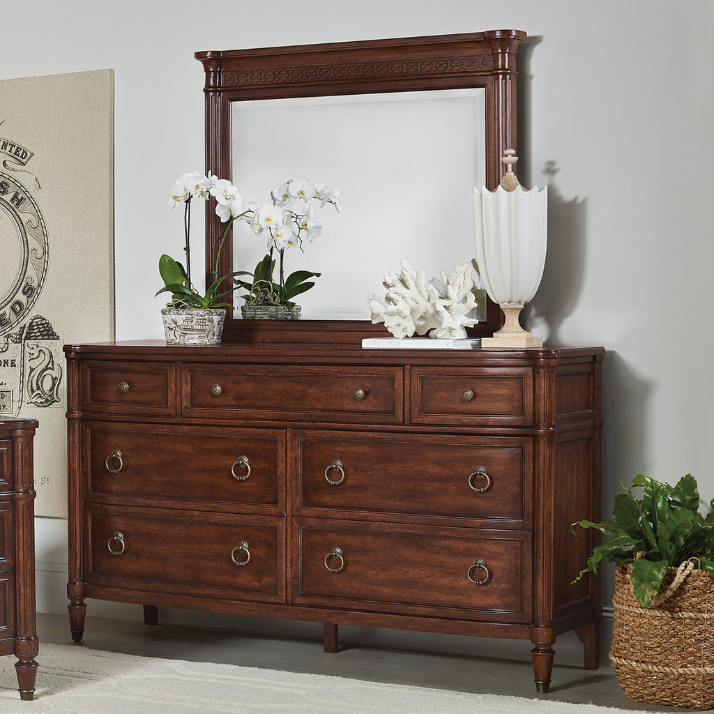 The vintage charm of the coastal South meets the traditional soul of the Federal and Georgian design period with the Charleston Beveled-Edge Landscape Mirror. Carved posts and delicate fretwork accents add distinction and allure. Crafted of Cherry Veneers, it is finished in Maraschino Cherry using natural grain veneers showcasing dramatic cathedral patterns and naturally occurring knots in the wood.
