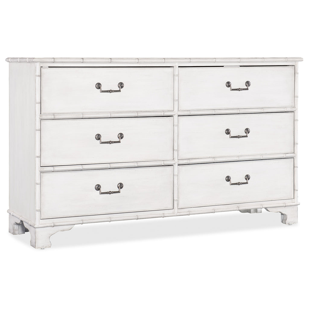 Inspired by the tropical craftsmanship of the West Indies and the cane accents of the classic British and Dutch Colonial design periods, the Charleston Six-Drawer Dresser has bamboo-motif trim and six drawers with self-closing drawer guides. The wood chest is finished in White Heron, a softer interpretation of the classic Southern limestone white with a slightly brighter sheen, delivering an heirloom-quality finish. The top left drawer has a removable felt liner and jewelry tray, and the top right drawer has a removable felt liner. The drawer interiors are painted gray, and both bottom drawers are cedar lined. Accented by antique pewter-colored decorative bail pulls.