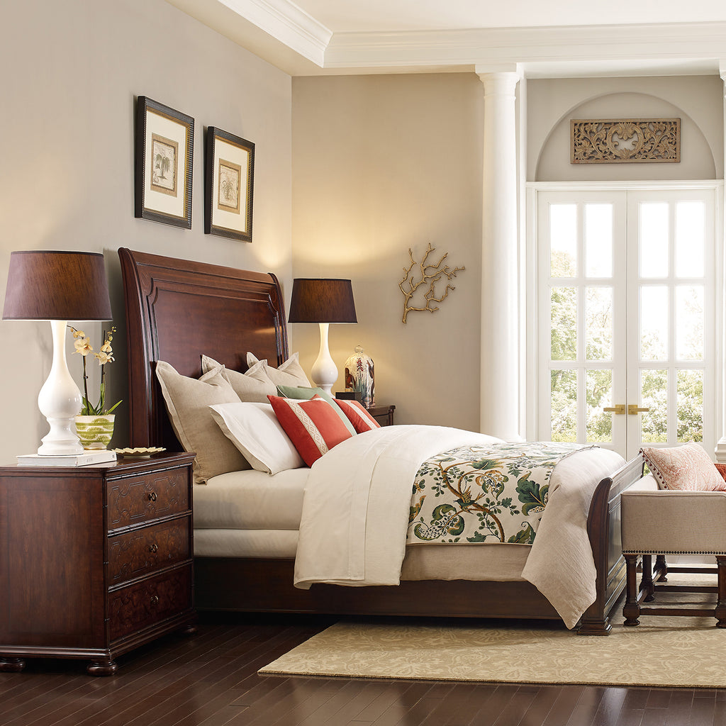 Celebrate the traditional soul and sophisticated beauty of Federal and Georgian design with this majestic Charleston Three-Drawer Nightstand adorned by inlay accents on the drawer fronts and updated for today with bun feet and tech-friendly features. Each of the 3 self-closing drawers has a cherry color interior. Crafted of Cherry, Walnut Veneers, Walnut Inlay and Olive Ash Burl, it features a vibrant Maraschino Cherry finish.