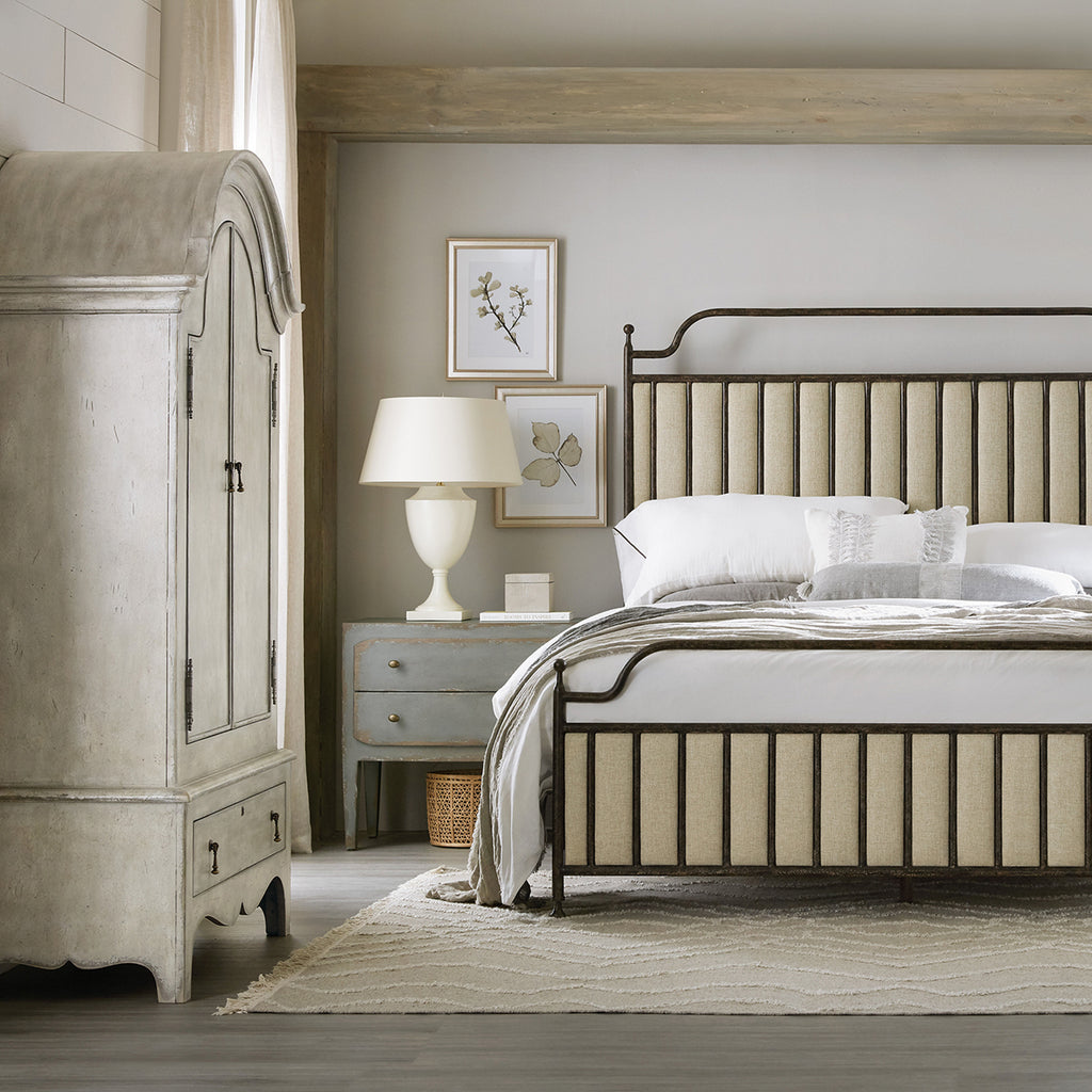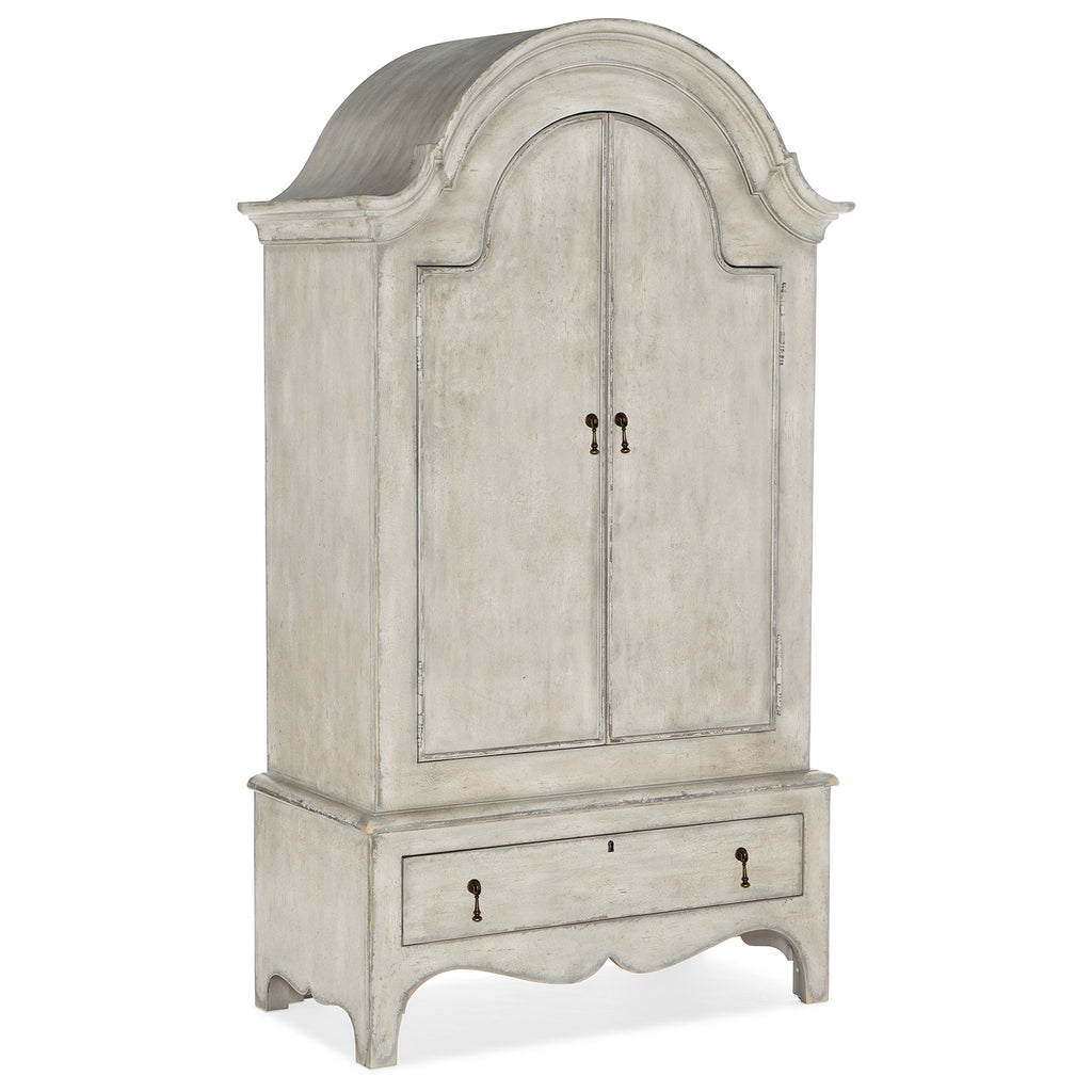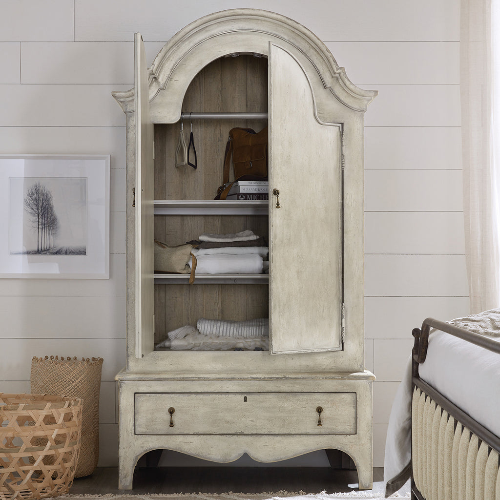 From the tip of its arched top to its delicately scalloped base, the Ciao Bella Wardrobe is all romance. In a dreamy creamy finish that is hand-chiseled to look beautifully aged, the wardrobe is packed with storage with two doors, two adjustable shelves, a clothing rod and one drawer. This casual yet elegant focal-point designer piece is crafted of Poplar and Hardwood Solids with Maple and Pine Veneers.
