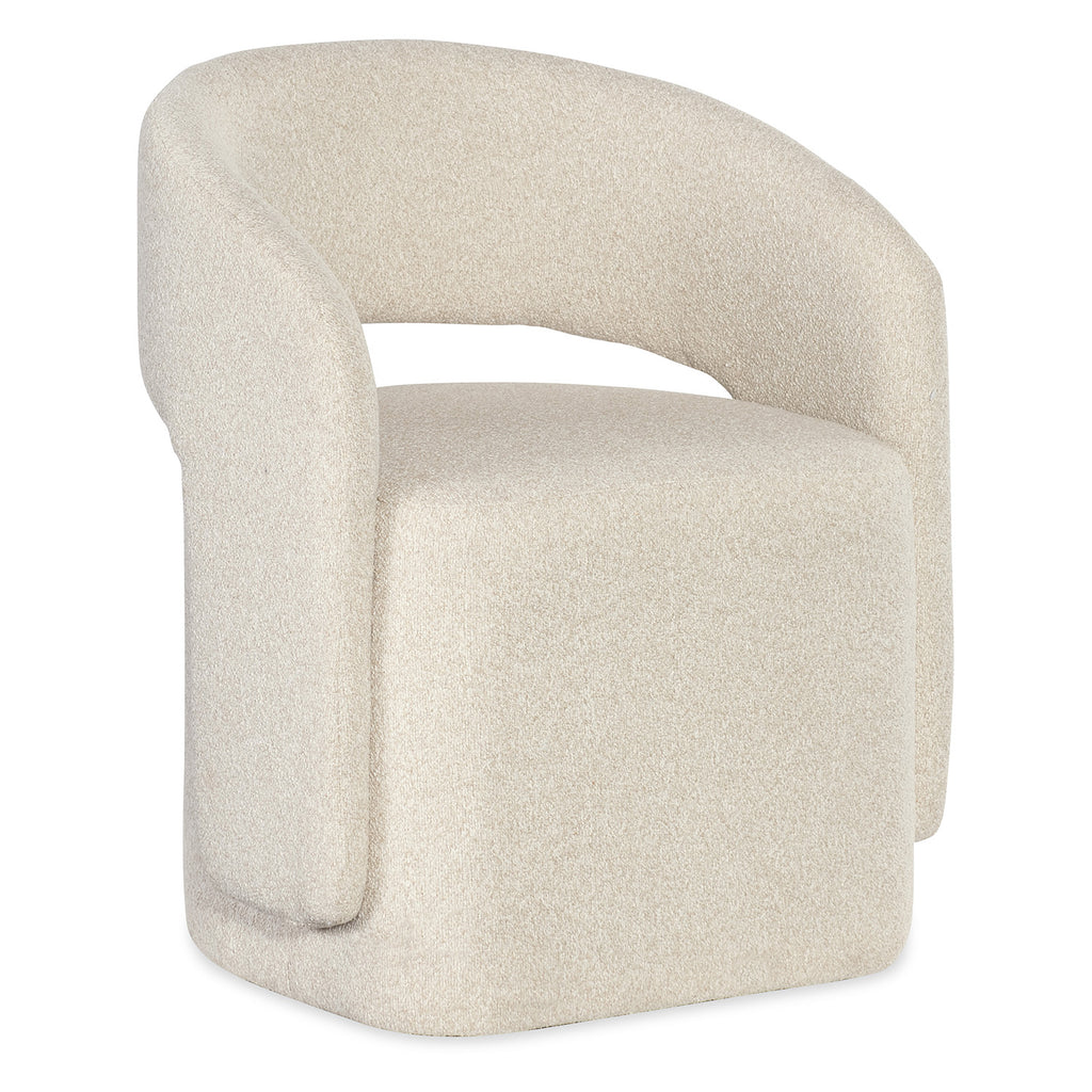 Softly rounded and fully upholstered, this arm chair features a barrel-style open back and plush Matera Pearl fabric. A stylish and comfortable companion to any modern dining table. Targeting the next generation of furniture buyers, Hooker Furniture unveils the Commerce & Market brand of accent and occasional pieces. Interior designers were front-of-mind when the Hooker Furniture team developed the dynamic palette and flexible applications of pieces within the new brand. The assortment of modern and updated designs presented within the brand include a dynamic variety of materials, styles and color palettes to inject a younger sensibility into the company’s portfolio. Commerce & Market consists of pieces for the living room including a variety of accent tables, credenzas, consoles, chests, cabinets, etageres and bar carts. Globally sourced with design inspiration from around the world, the curated designs feature an eclectic assortment of materials including cast metals, bone inlay, marble, stone, travertine, painted glass, acacia solids, pecan, oak, mango wood, and walnut veneers in a variety of rich finishes.