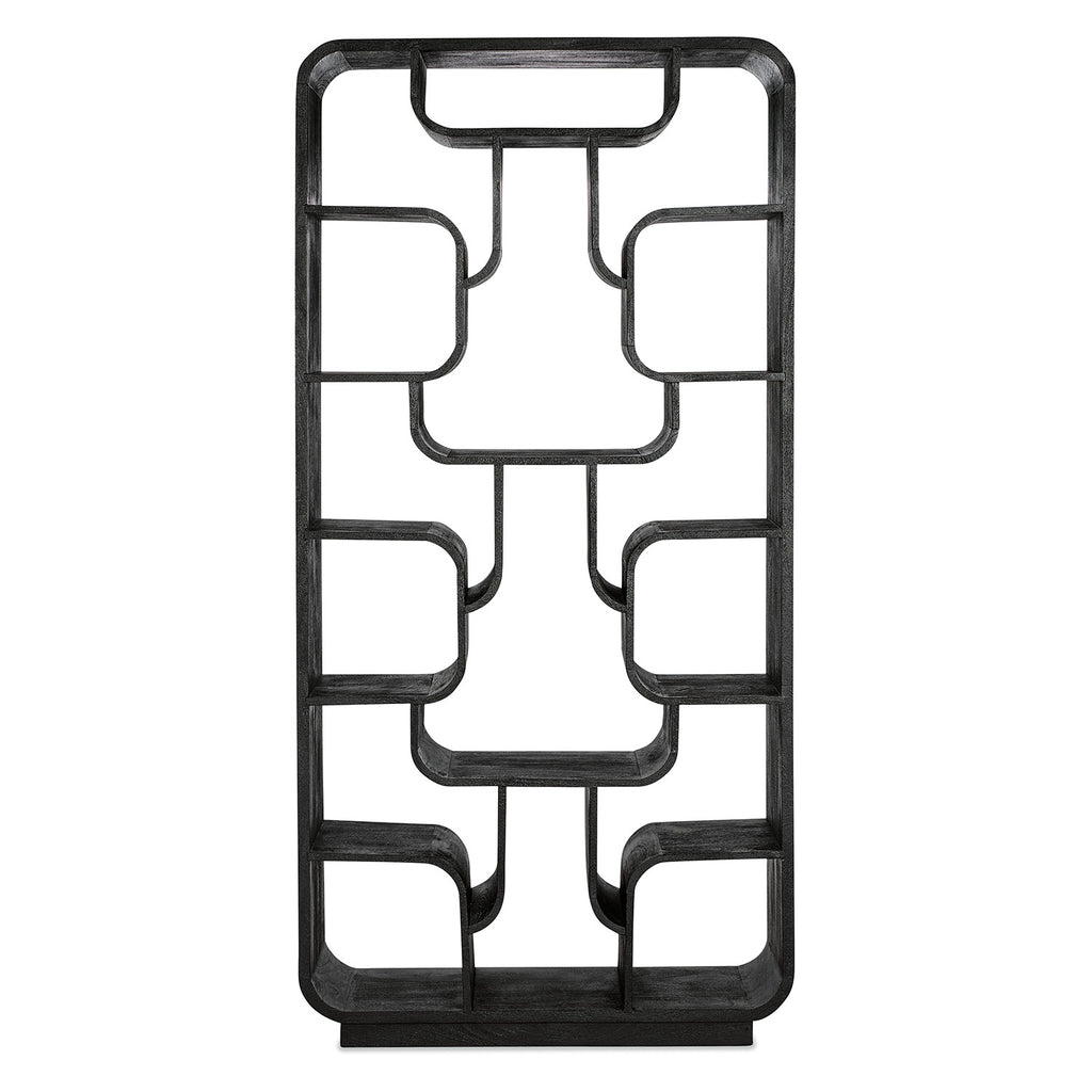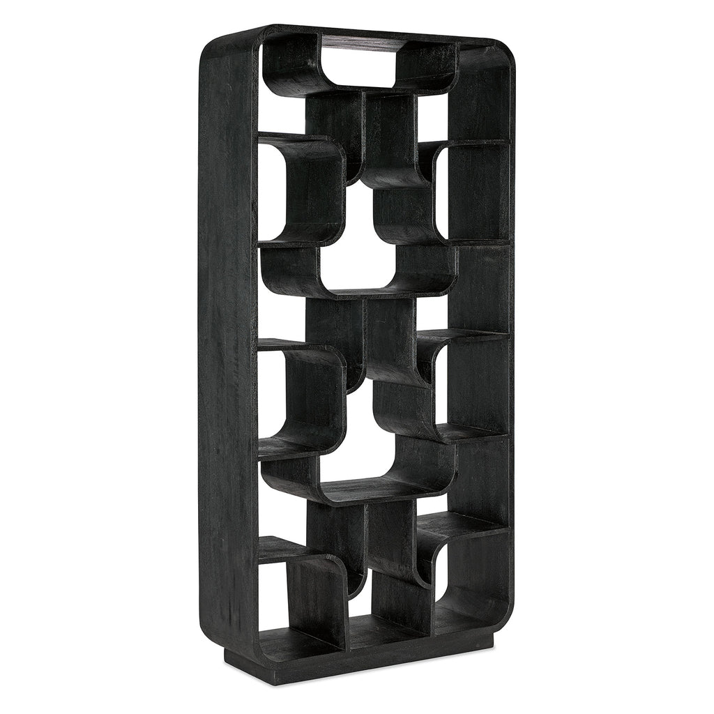 Make a bold vertical statement with the Sloane Etagere. With curved edges, sixteen open spaces, and a black finish on mango wood, it's ideal for showcasing books and decorative objects in a curated home office or living room. Targeting the next generation of furniture buyers, Hooker Furniture unveils the Commerce & Market brand of accent and occasional pieces. Interior designers were front-of-mind when the Hooker Furniture team developed the dynamic palette and flexible applications of pieces within the new brand. The assortment of modern and updated designs presented within the brand include a dynamic variety of materials, styles and color palettes to inject a younger sensibility into the company’s portfolio. Commerce & Market consists of pieces for the living room including a variety of accent tables, credenzas, consoles, chests, cabinets, etageres and bar carts. Globally sourced with design inspiration from around the world, the curated designs feature an eclectic assortment of materials including cast metals, bone inlay, marble, stone, travertine, painted glass, acacia solids, pecan, oak, mango wood, and walnut veneers in a variety of rich finishes.