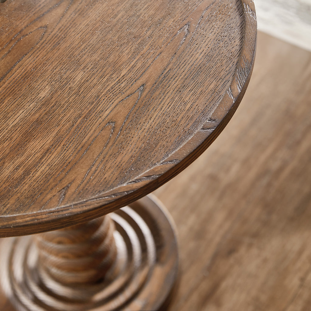 In a vintage design with a nostalgic bobbin base, the Accent Table is 22 inches round and crafted of Oak Solids and Veneers in a natural medium finish.