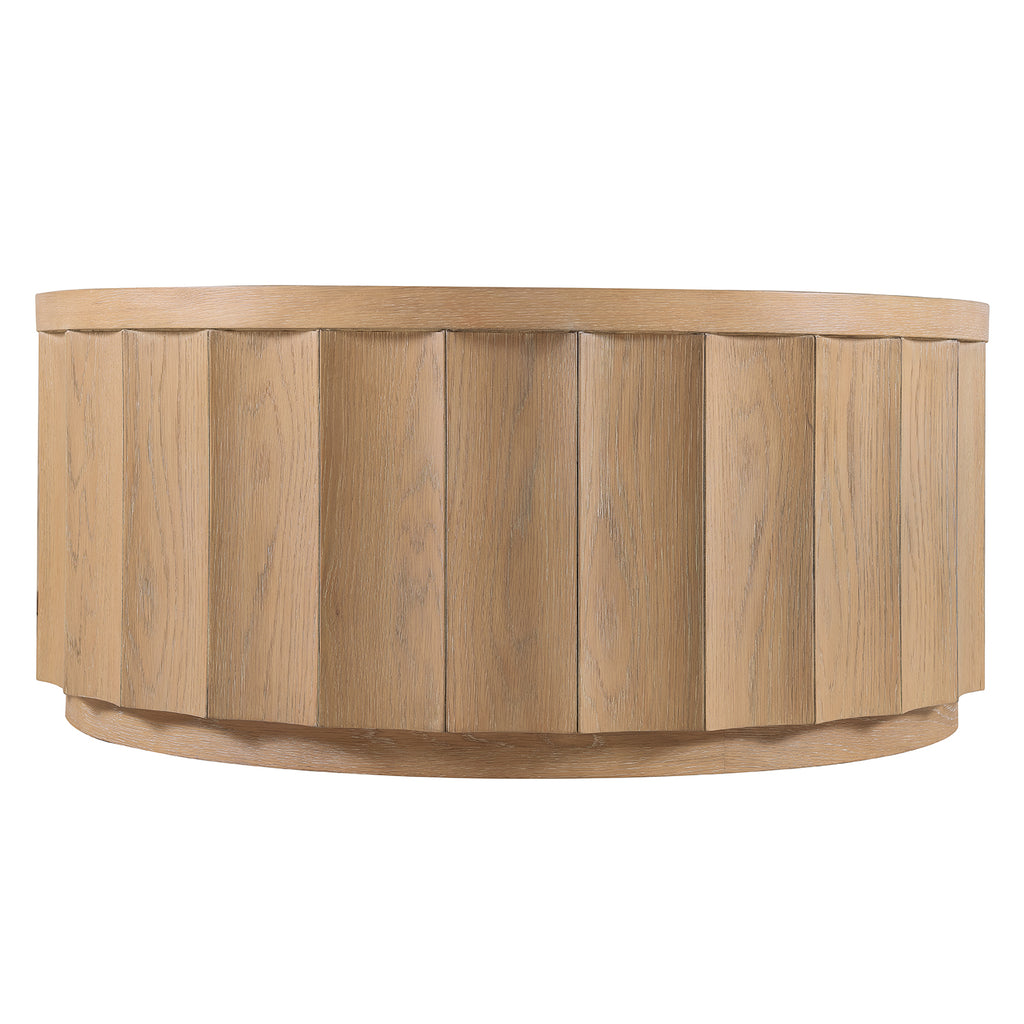 This round cocktail table features a scalloped silhouette, light oak finish, and hidden casters for flexible living room styling. Targeting the next generation of furniture buyers, Hooker Furniture unveils the Commerce & Market brand of accent and occasional pieces. Interior designers were front-of-mind when the Hooker Furniture team developed the dynamic palette and flexible applications of pieces within the new brand. The assortment of modern and updated designs presented within the brand include a dynamic variety of materials, styles and color palettes to inject a younger sensibility into the company’s portfolio. Commerce & Market consists of pieces for the living room including a variety of accent tables, credenzas, consoles, chests, cabinets, etageres and bar carts. Globally sourced with design inspiration from around the world, the curated designs feature an eclectic assortment of materials including cast metals, bone inlay, marble, stone, travertine, painted glass, acacia solids, pecan, oak, mango wood, and walnut veneers in a variety of rich finishes.