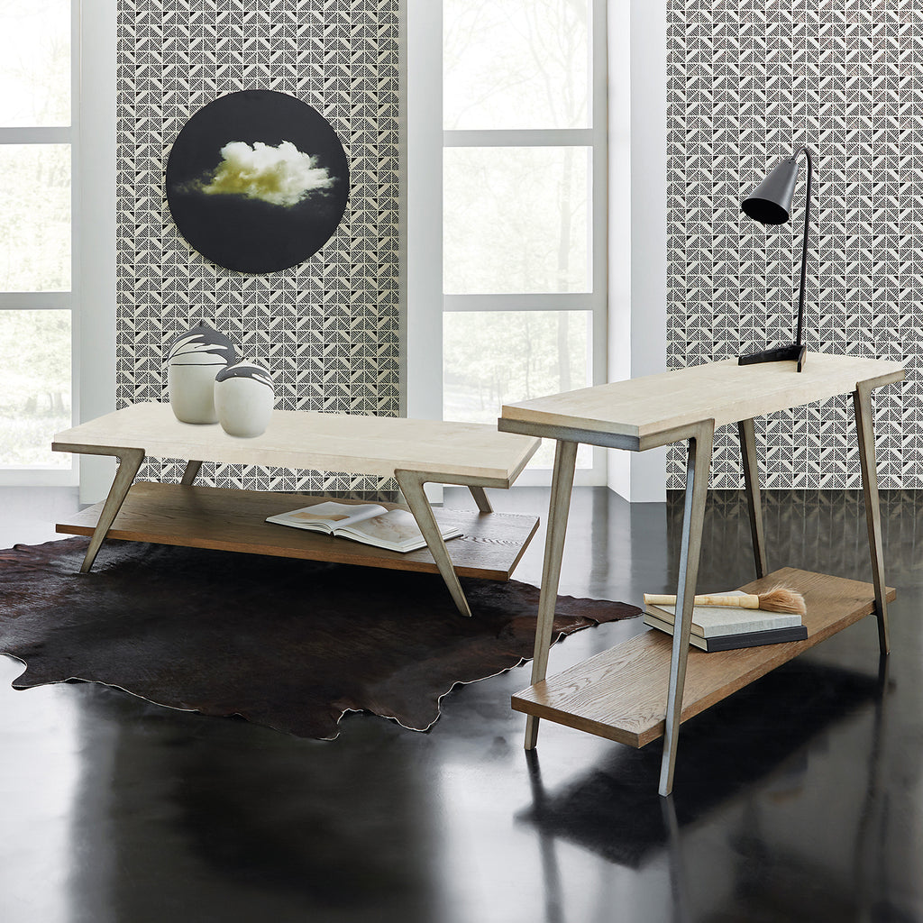 Modern materials meet timeless surfaces in the mixed-media Boomerang Console Table. With an eclectic elegance, the 61-inch-wide table combines a Travertine marble top with a metal frame and legs and one wood fixed shelf. Crafted of Oak Veneers, the marble top is cream colored with a natural medium wood finish and gray metal frame and splay legs.