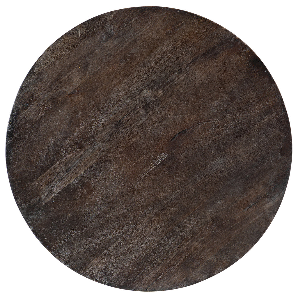 Globally inspired and artistically crafted, the Carved Round Commerce & Market table is made of Mango Wood and Iron in a dark wood finish, with gold metal legs and a carved tribal motif around the edges.