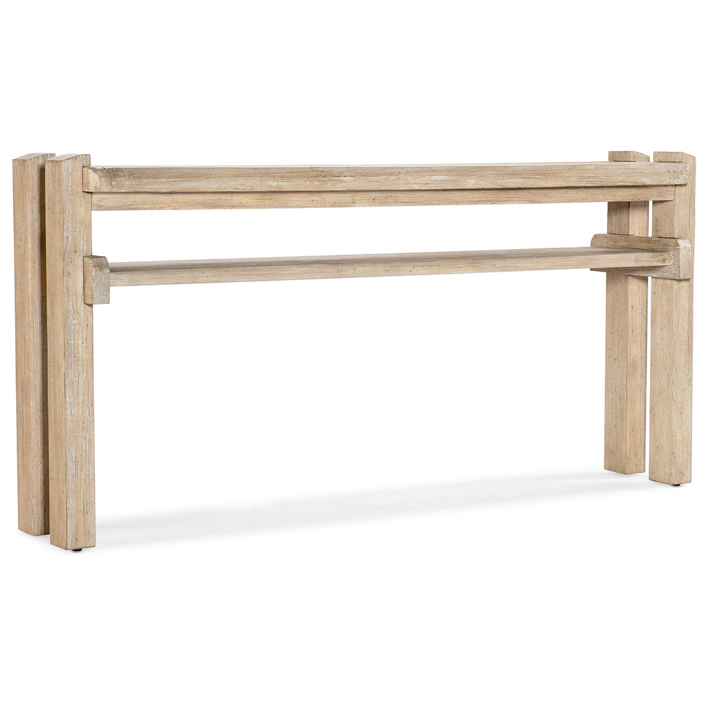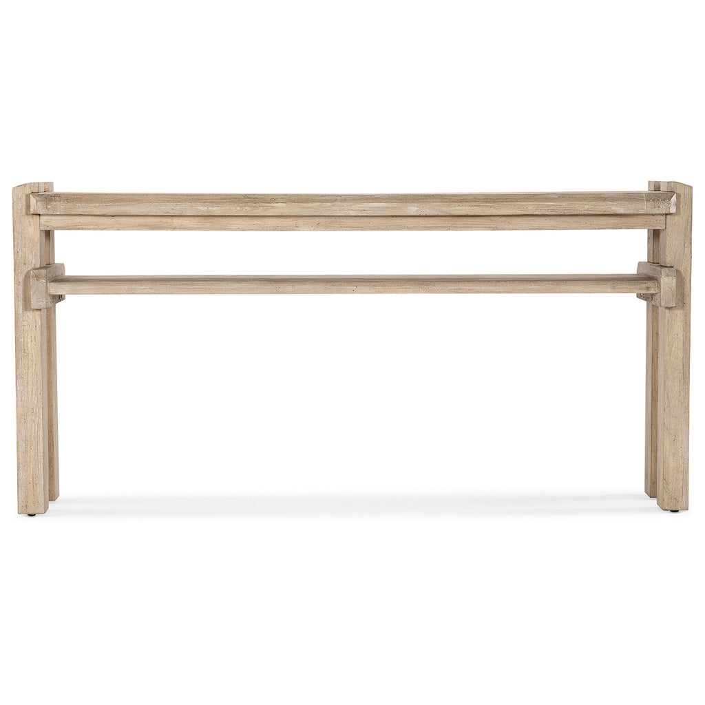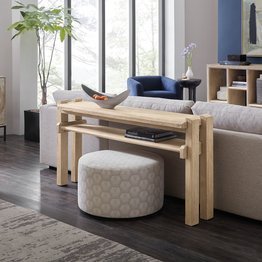 In a chic and chunky silhouette and interlocking post design, the Commerce & Market Console is crafted of Clean Acacia Solids in a light natural finish. With one fixed shelf, the console has a narrow rectangle shape, making it convenient for even smaller spaces.